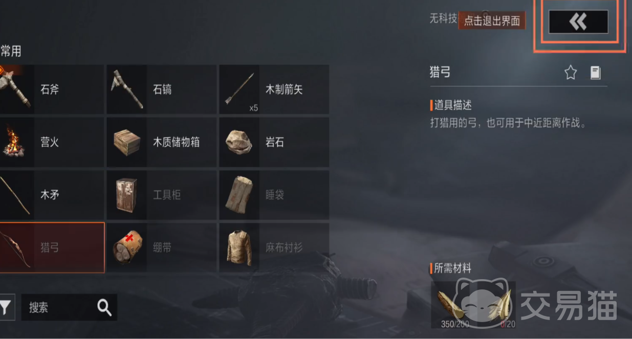 其实想要制作一把猎弓非常简单,大家第一步做的事情就是去寻找各种物品。例如他所需制作的材料,其中就包括200个木材以及20个藤条。这时只需要拿起手中的石头或者斧头,就可以去劈砍附近的物品,包括树木或者石头,这时就会掉落这些材料。