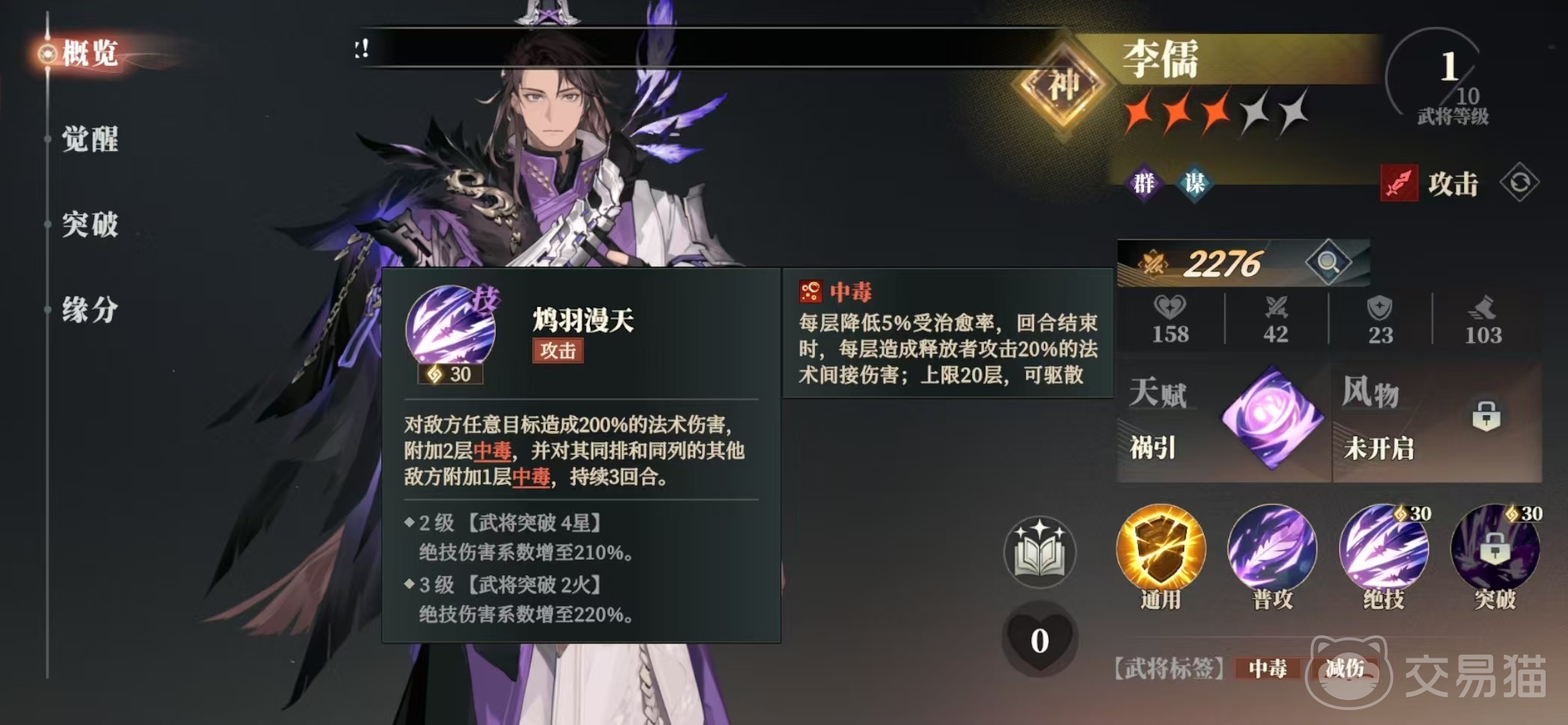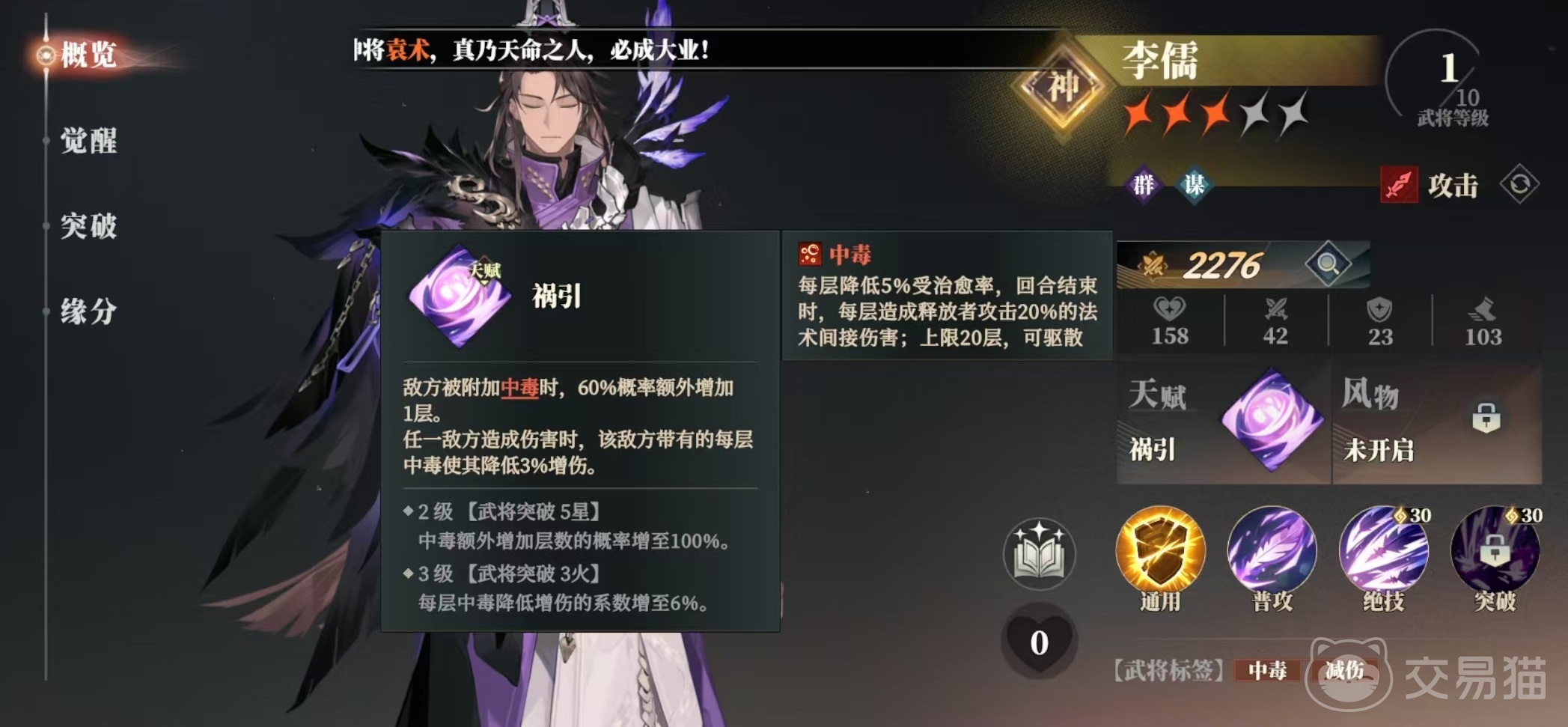 李儒的绝技可以使敌方任意目标受到法术伤害后,并附加2层中毒,并且对同排和同列的其他敌人附加1层中毒,是属于群体中毒效果。自身的天赋在敌方被附加中毒时,有额外几率在额外增加1层,任意敌方造成伤害时,该角色带有的每层中毒,都能使其降低3%增伤。对方被中毒影响之后,每层还会额外降低5%受治愈率,在回合结束时会受到释放者攻击力20%的法术间接伤害,中毒最多叠加的20层,可被驱散。