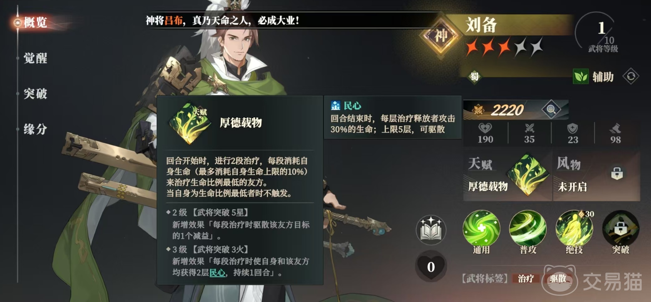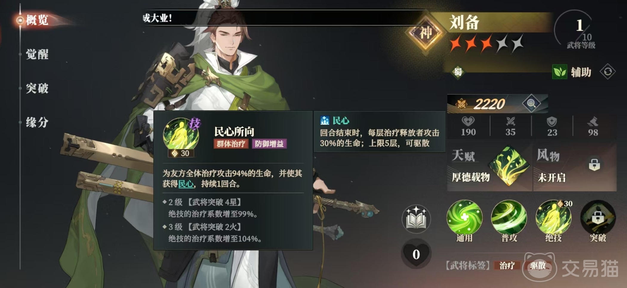 刘备的绝技效果是给全体友方武将进行一次治疗,并使治疗目标获得民心效果。民心的效果是在回合结束后,每层可以治疗释放者攻击力30%的生命值,最多能叠加到5层,可以驱散。自身天赋在回合开始时进行两段治疗,每段消耗自身生命值,最多消耗生命上限的10%,来给生命比例最低的友方进行治疗。如果刘备是生命最低的那一个,则不触发效果。