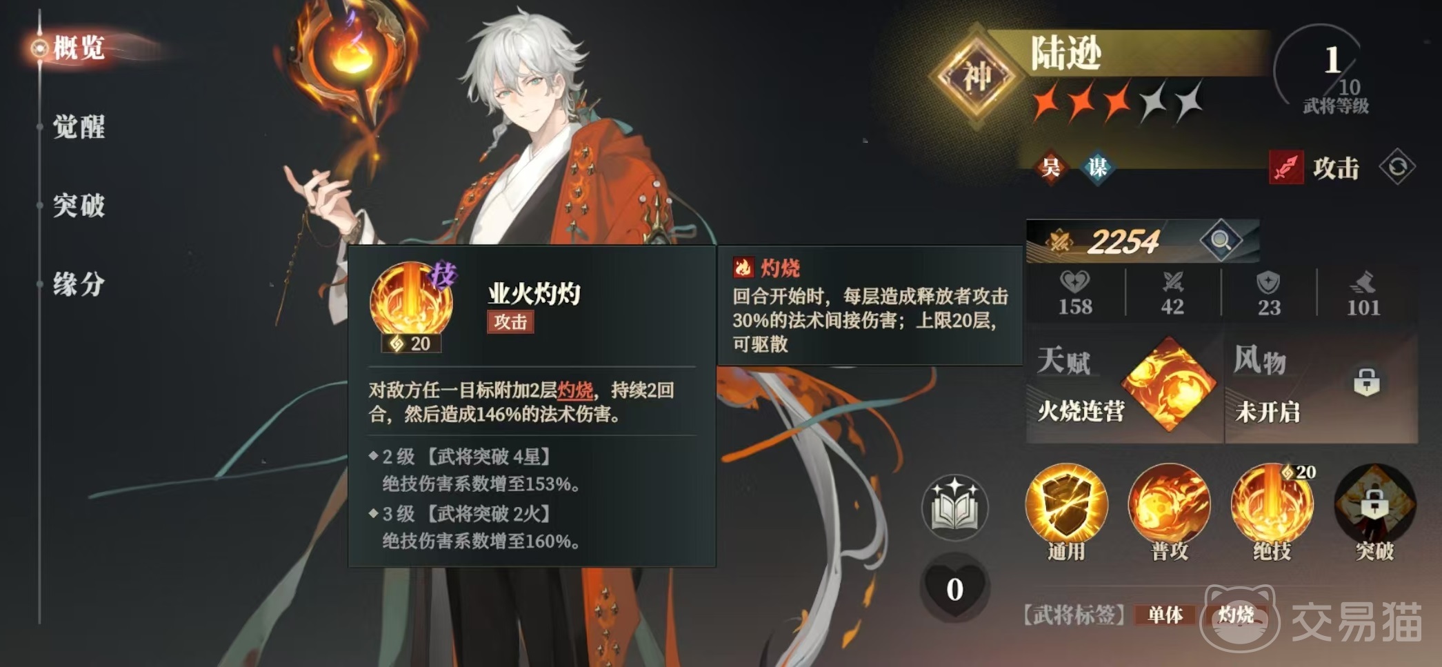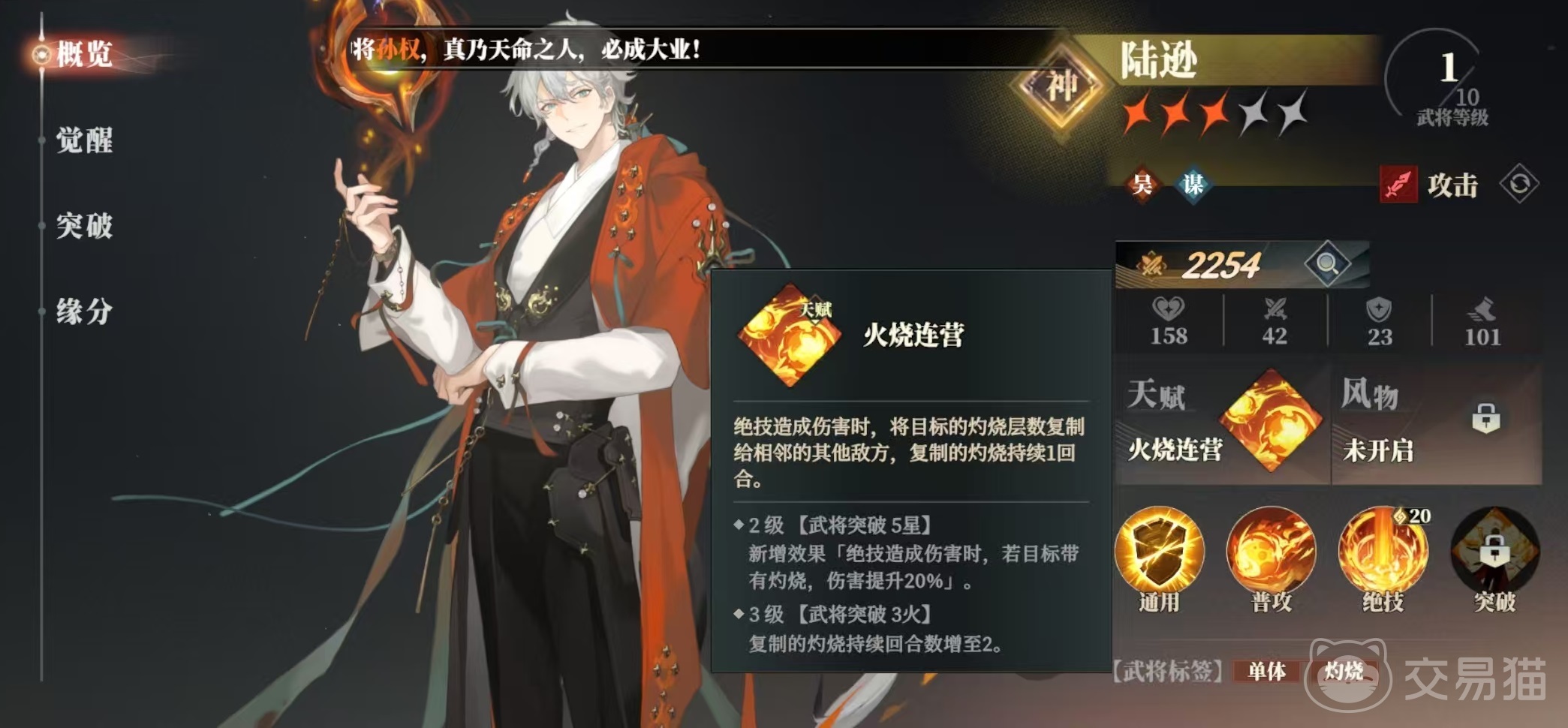陆逊是属于游戏中的吴国阵营,它本身也是很强的谋士。自身的天赋火烧连营,在使用绝技造成伤害时,会将目标的灼烧层数复制给相邻的其他目标,复制的灼烧持续一回合。绝技是业火灼灼,对敌方任意目标附加两层灼烧,持续两回合,然后造成一次法术伤害。对方被灼烧之后,每回合开始都会受到释放者30%攻击力的法术间接伤害,最多能叠加到20层。所以陆逊最适合的就是组成火烧队,当然这少不了另一个核心武将周瑜的帮助。
