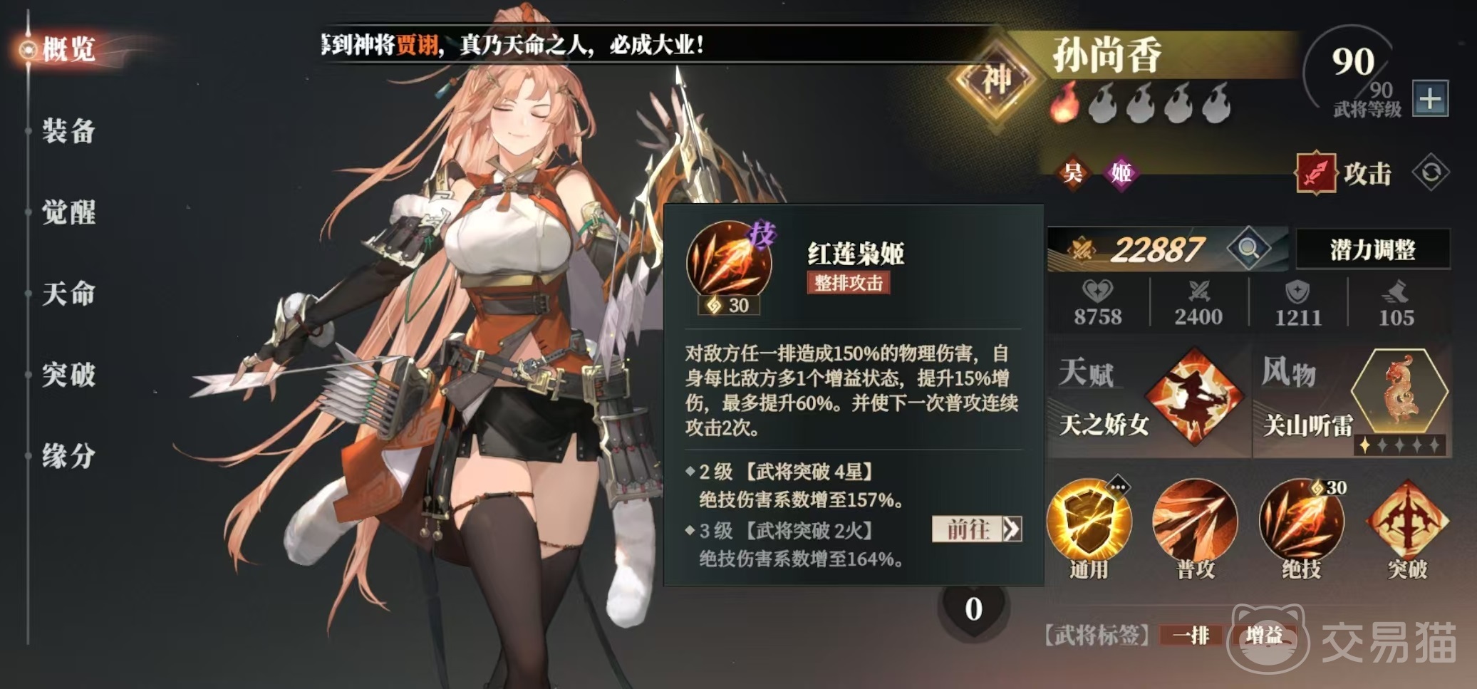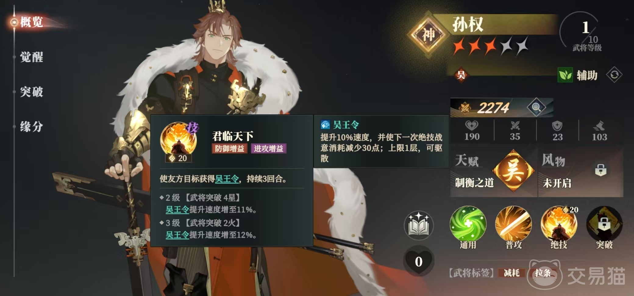 孙权的绝技君临天下,使有方目标获得吴王令,持续三回合。在吴王令的影响下,能提升10%速度,并使下一次绝技战意消耗减少30点,只能叠加一层,可以被驱散。通过进行突破,吴王令速度能够增加到最多12%。自身天赋制衡之道,在回合结束时,孙权自身获得一层经略效果,当拥有三层经略时,消耗全部层数来使友方全体提升10%行动条。所以孙权是一个能够拉条和给友方带来速度增益以及战意消耗减少等增益效果的辅助。