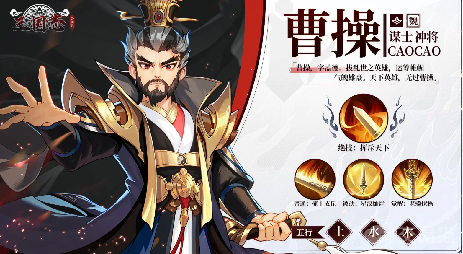 曹操隶属魏阵营,职业为谋士。其属性颇具特色,初始为土属性,攻击敌人时能治疗自身,保证续航;八十级激活水属性,对带有减益效果的敌人可造成更高伤害;一百级激活木属性,技能额外伤害大幅提升。游戏中的五行体系相互克制,面对不同属性敌人,选择克制属性战斗,能大大提高获胜效率。
