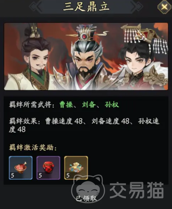 在阵容搭配上,若能同时拥有曹操、刘备和孙权,便可解锁专属羁绊【三足鼎立】,曹操、刘备、孙权三人速度均增加48。速度的提升在战斗中至关重要,能让武将更快出手,抢占先机。