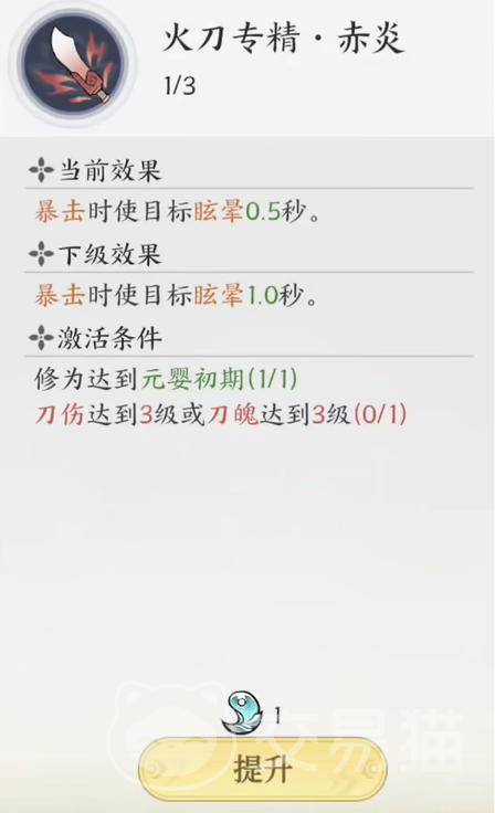 想要激活的话,需要刀魄或者刀伤达到三级,以及修为达到元婴初期。不过这并不代表其他分支不能学。如果大家玩的比较花,也可以全部学1级。火刀带来高频稳定的伤害,控制效果也好,所以可以直接拉满。