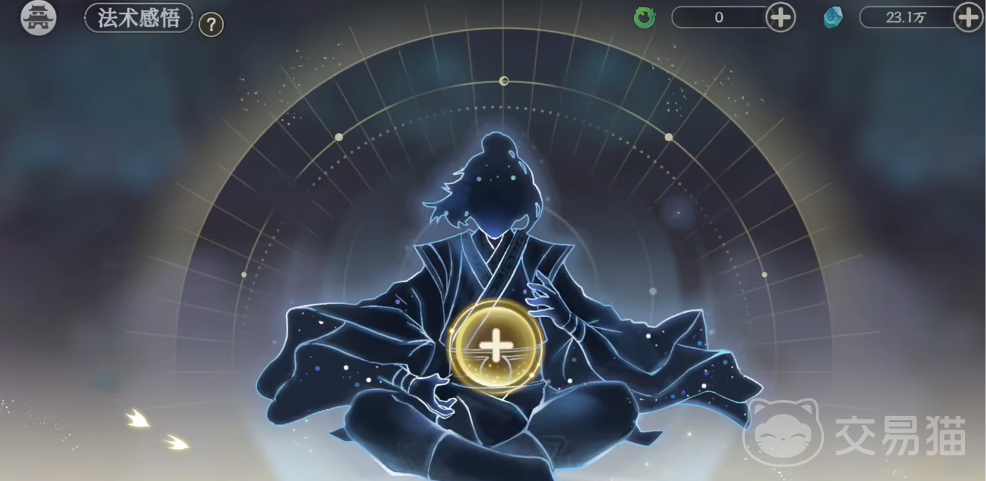 如果大家想要感悟法术的话,可以先点击选项当中的法术感悟。进去之后就可以看到一个正在打坐的人,这时在他的胸口处有一个加号。大家可以点击这个加号,然后就会显示出你当前所拥有的所有法术。