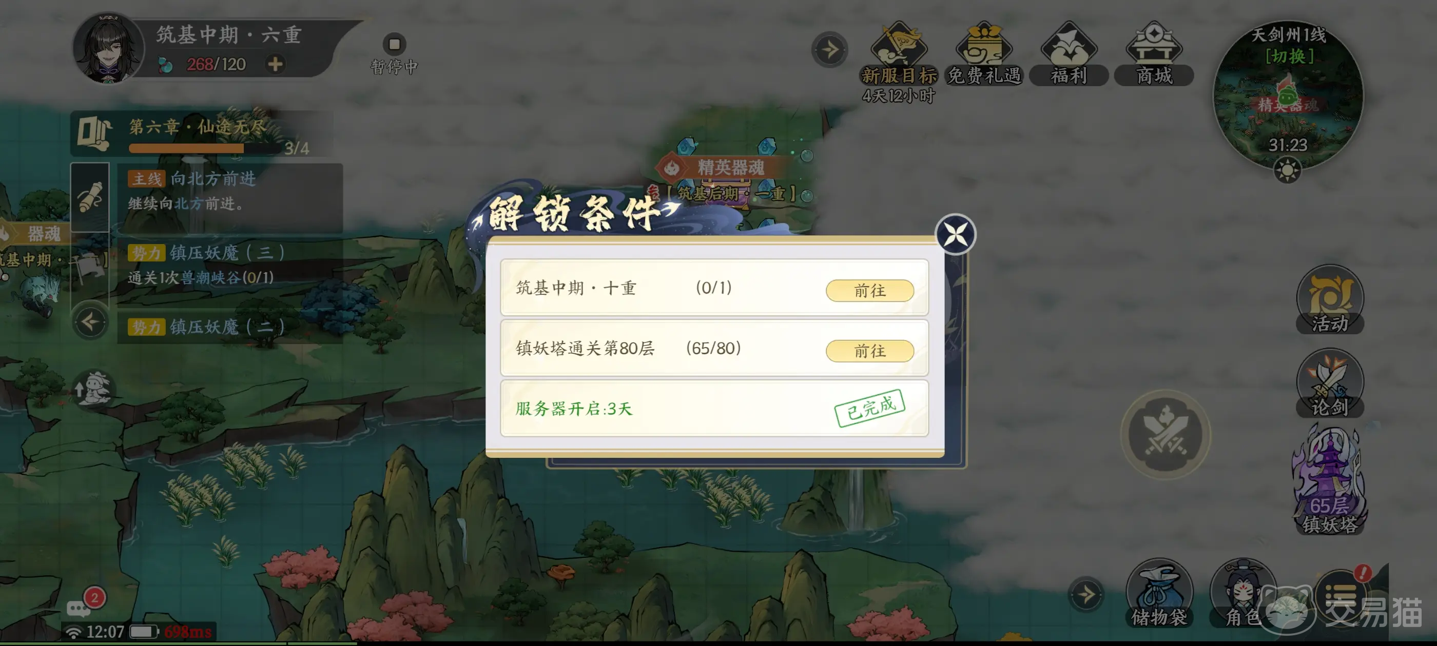 其实一刚开始的时候,大家的实力并不足以去刷副本。所以大家要完成相应的副本解锁条件之后,才能够去探索各种副本并开始攻略。首先你的修仙等级至少要达到筑基中期10层,另外还要通关镇妖塔80层,然后服务器也要开启三天之后才能解锁。