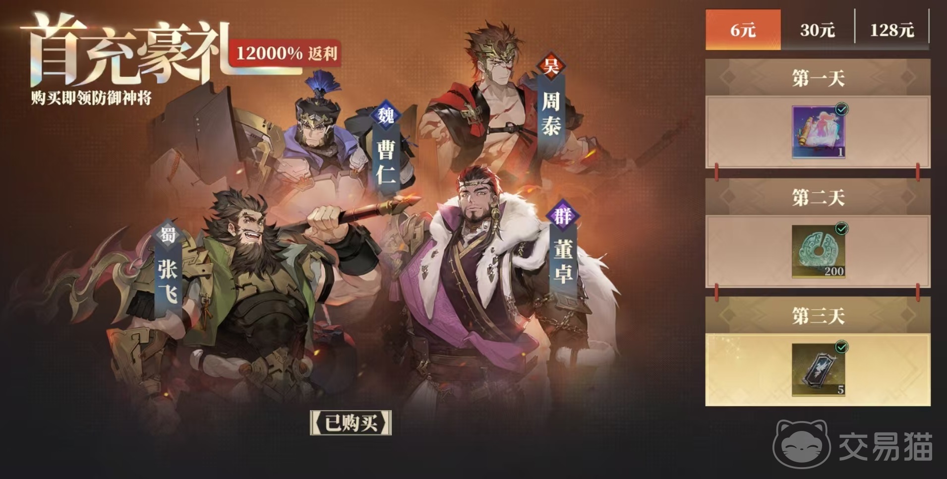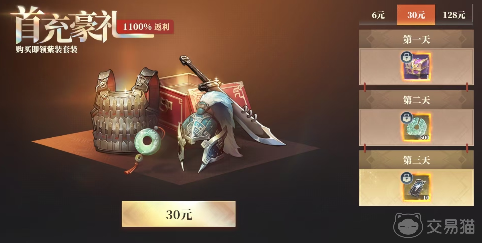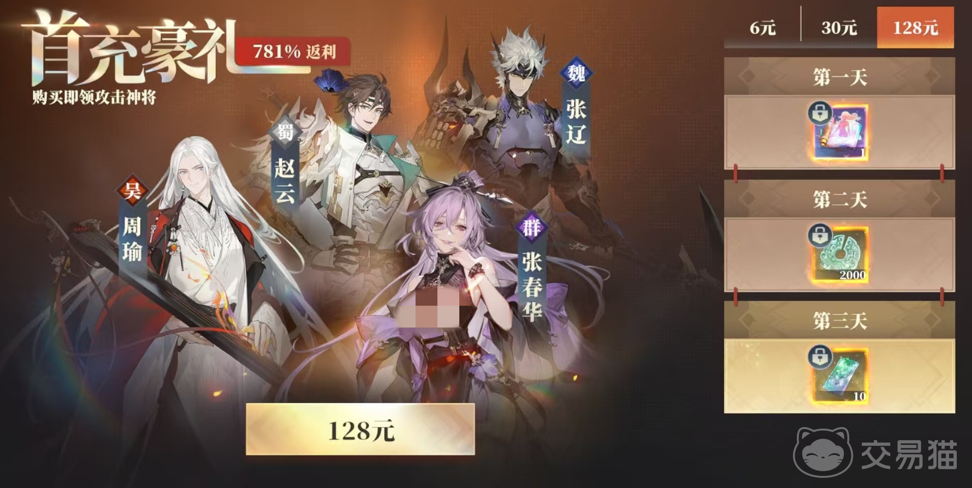 大家开启游戏之后,直接就可以选择是否进行一次首充,首充一共分为三个档次,分别是6元档,30元档和,128元档。在性价比方面,小编认为价格越低,也就越值得去上手,例如6元档,一共包含有三天奖励,第1天送一个防御神将自选包,第2天赠送200三山壁,第3天赠送5个天机令。