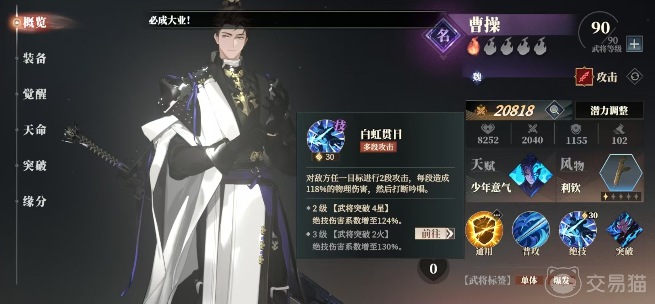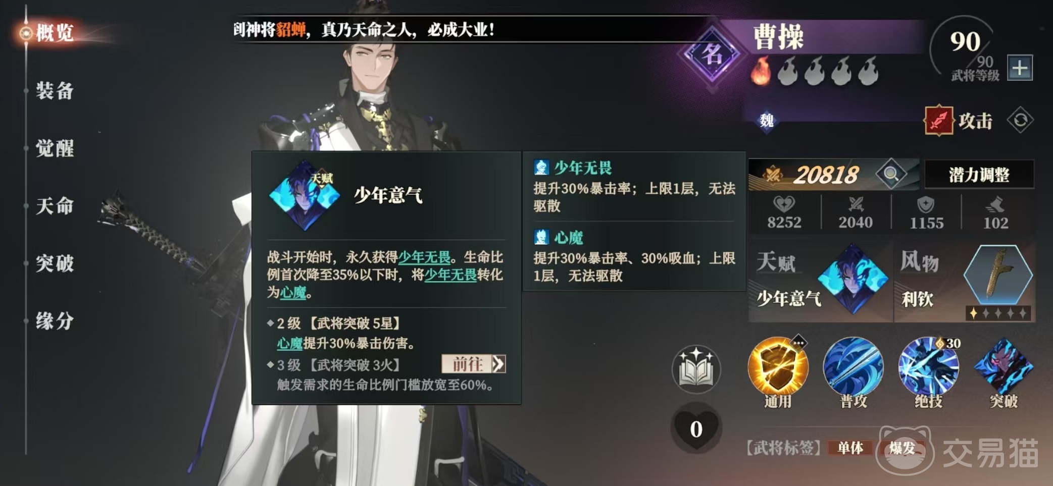 曹操的绝技白虹贯日是一个多段单体攻击技能,对任意目标进行两段攻击,然后直接打断对方的吟唱。这个技能不仅伤害高,更是有着打断效果,在很多战斗中都有着必要。的作用,自身天赋,少年义气战斗开始时永久获得少年无畏状态。如果生命比例首次降至35%以下,那么少年无畏将转换成心魔少年无畏能提升30%暴击率。心魔除了30%暴击率之外,还有30%吸血,这样在曹操采血的时候可以依靠吸血提高生存。