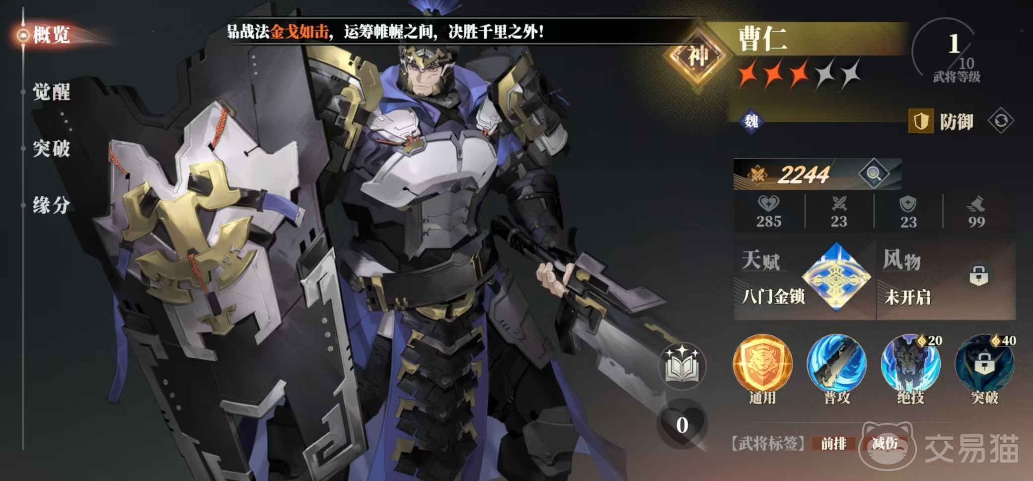因为前期通关剧情直接就赠送大量曹操魂石,所以这是一个能够较容易就培养起来的武将,也是很多阵容中的单体输出核心。在一定程度上,曹操可以取代张辽成为单体输出的首选,因为养成比较简单。在阵容搭配方面,如果想走魏国国家队,那么就选择和典韦一起出战,前排当然是曹仁,如果没有曹仁,使用孙开朗作为前排肉盾也是可以的。曹操以及孙开朗是比较合适的队友,孙开朗的绝技同样是多段攻击并带有驱散效果,和曹操的打断能够很好地配合起来。但曹仁是最佳选择,因为曹仁能够激活魏国阵营,首充就可以直接拿下。