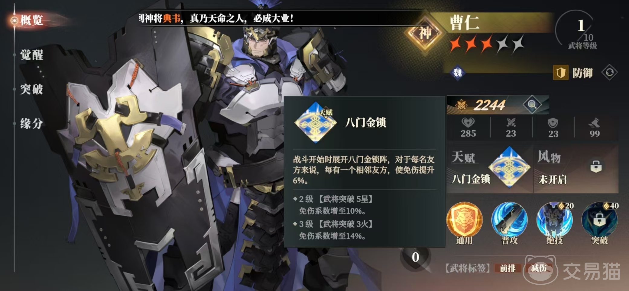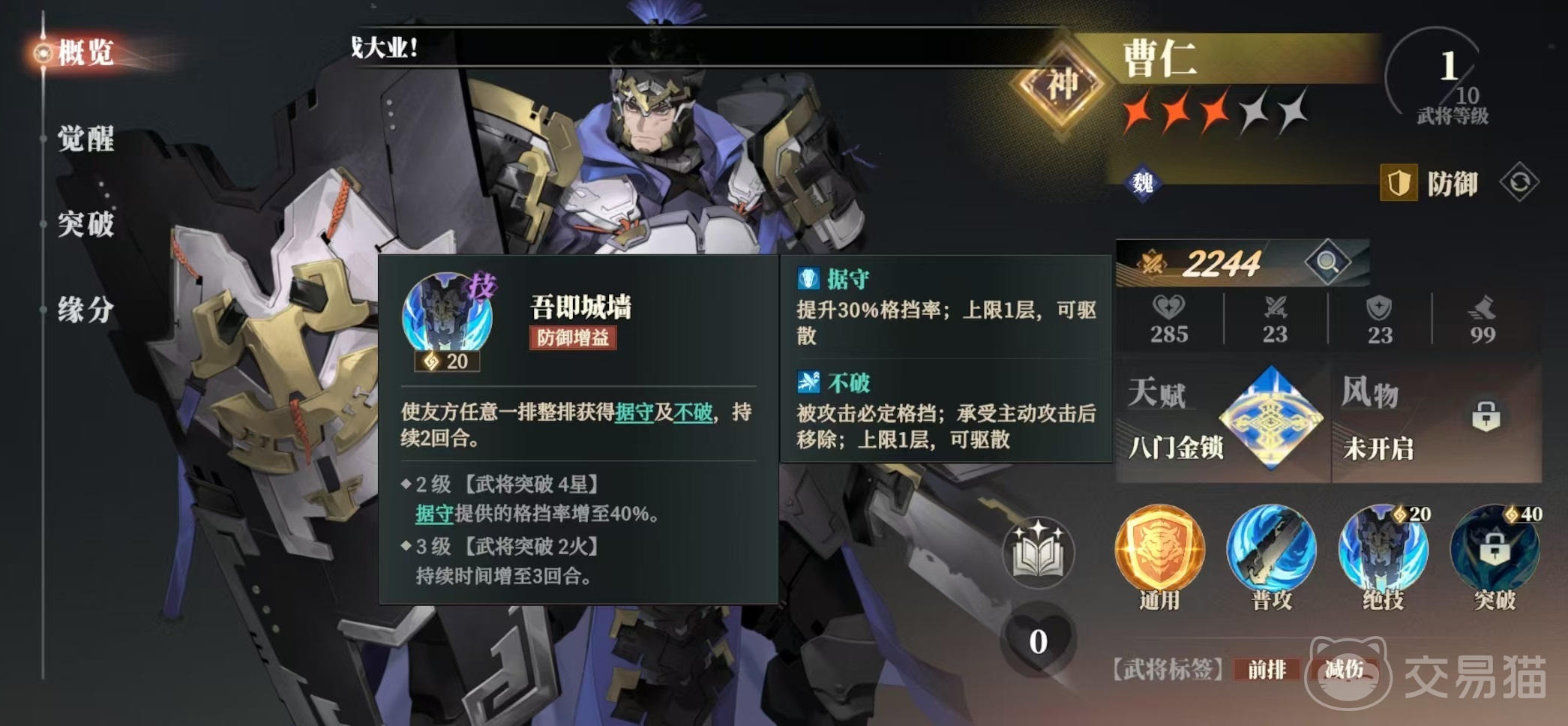 作为魏国的防御型武将,它的绝技可以使友方任意一整排,获得拒守和不破这两个效果,持续两个回合。拒守能够最多提供40%的格挡率加成,不破使得被攻击必定格挡,承受一次主动攻击后移除。这对于整排玩家的生存能力都是很大的提升,曹仁的天赋八门金锁,在战斗时直接是展开,对每个友军来说,每有一个相邻的友方,就可以获得最多14%的免伤。