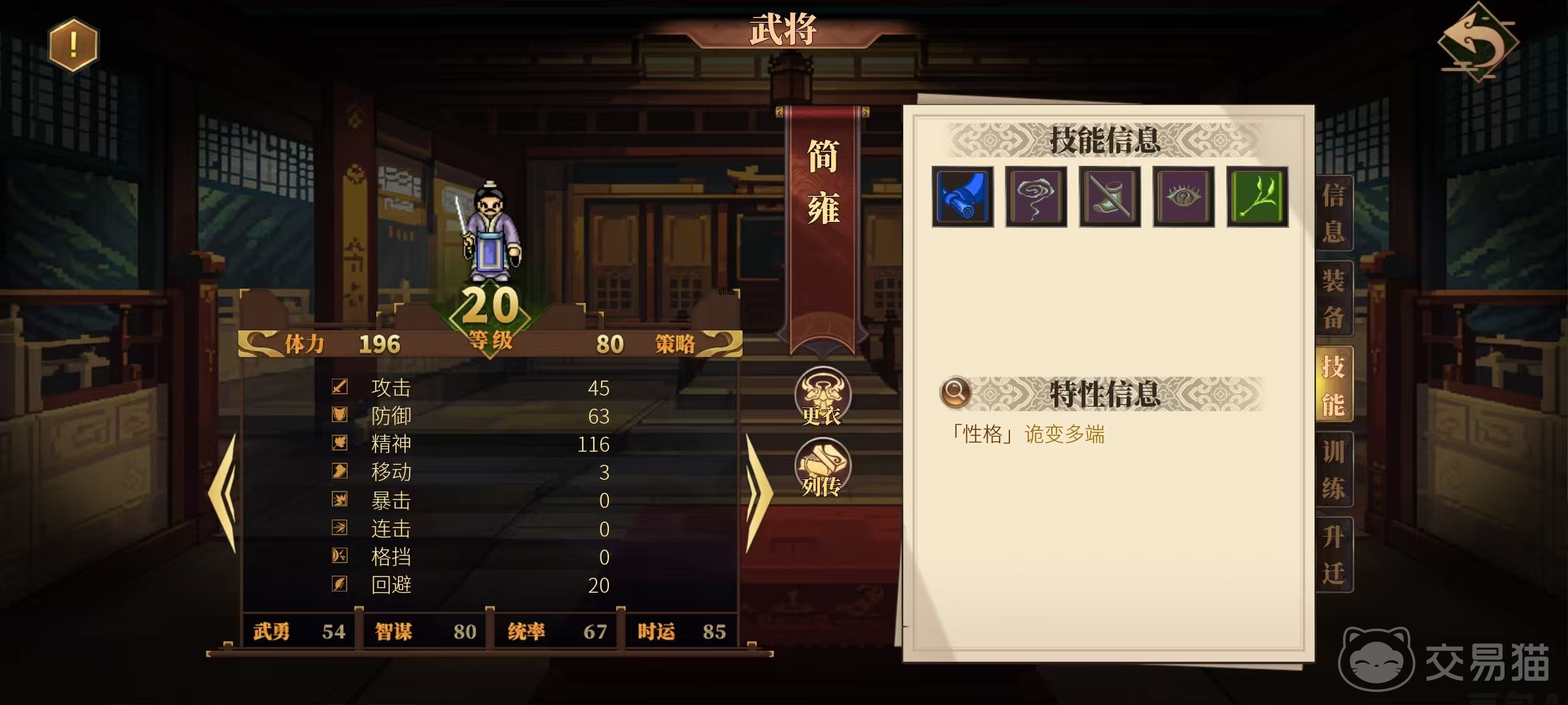 在游戏中简雍是大家前期就可以使用到的一名武将,他也是刘备在求学时的好友,后续成为刘备重要的幕僚,今天小编来分析一下建安外史简雍怎么样。这名武将在属性和技能方面都很有特点,它也是属于常用的人物之一,为了能够发挥出优势,大家需要先了解清楚他的技能以及转职情况。