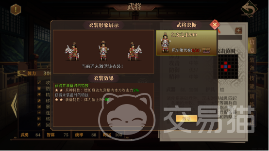 第一个培养方向自然是时装,角色都是有专属的时装的,将时装激活之后可以获得强化效果,获得装备时的特技,能增加身边九宫格内己方攻击力;第二方面就是装备,穿戴装备能明显的提升武将的属性,强化装备可以提高装备特性,强大的装备特性在战斗中总是有意想不到的作用。