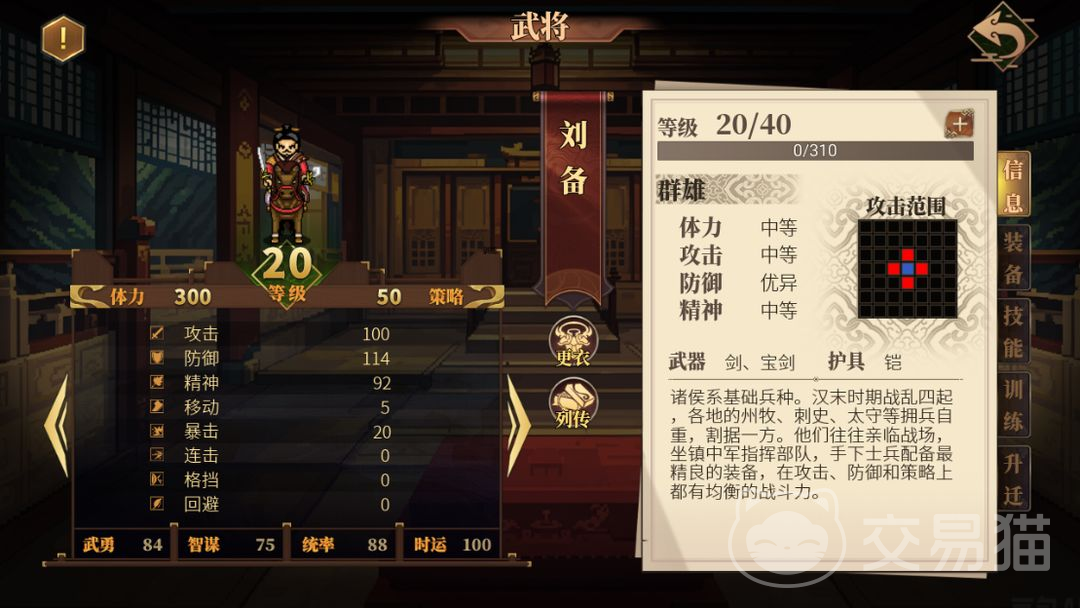 1、双股剑,主要的效果之一,反击后反击,在遭遇敌人的反击之后还能再攻击对手1次;强化反击,能提高反击时打出的伤害,最高增加25%;可提升格挡率,最高提升15%;反击敌人时连击,最高可达到30%;这种武器就比较适合刘备之类的武将使用。