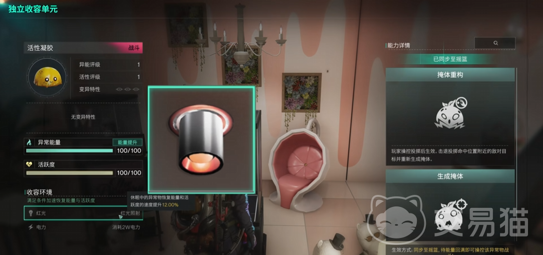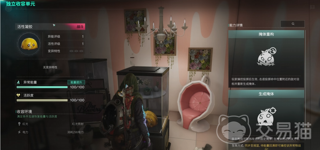 活性凝胶属于战斗型的异常收容物,异能的评级越高,战斗力就会越强,在收容单元同步到摇篮之后,就可以使用对应的两个能力,能力1“掩体构成”,可以将该物品投掷到目标区域,会直接生成掩体,这个掩体能抵挡敌方的子弹,直到异常能量的消耗结束。