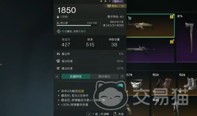 售卖配件(NPC“乔纳林”,每件3500转能电池):冲锋枪的改良弹匣、补强的改良弹匣、轻量化的制退器
