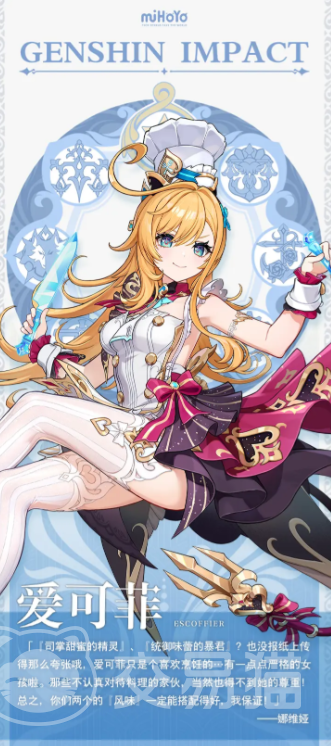 首先5.6卡池新角色已经确定有枫丹冰系厨师爱可菲、纳塔风系医生伊法,爱可菲是个喜欢烹饪在料理上有点严格的女孩,她的外在形象非常可爱,有一头橙色的头发,乍一看很像偶像团的成员,但实际因为厨师的职业,身上带着的是围裙。