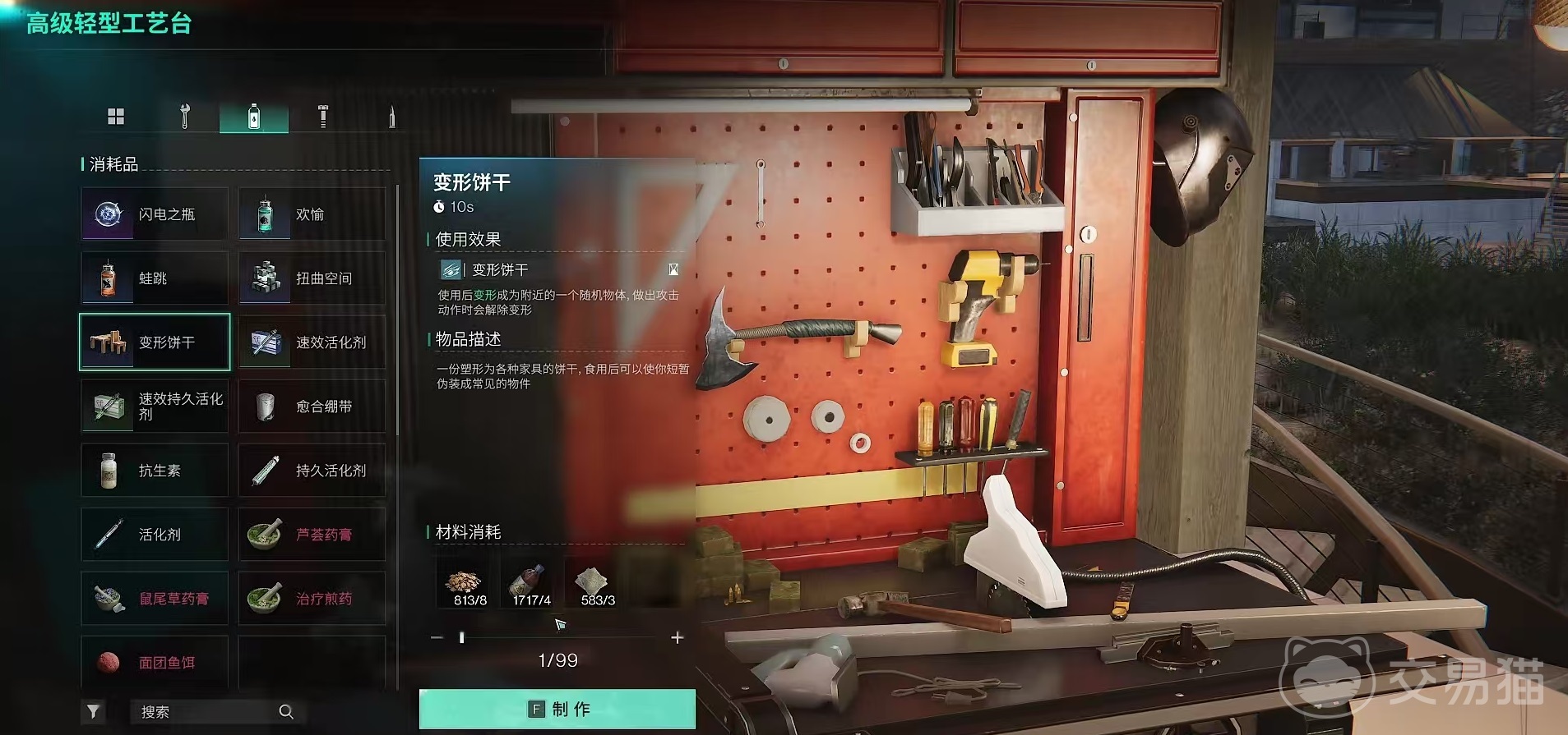 在变形期间只要不去主动攻击或者是与其他物体进行交互,就不会失去作用,怪物就会失去仇恨不去攻击玩家,这样在潜伏侦察或者是逃脱追击时非常有效。但是要注意,变形并不是可控的,而是随机选择一种。制作的变形饼干是属于消耗品,如果大家喜欢这种搞笑的趣味性,或者是确实有着战斗方面的需要,可以多制作一些随身携带。