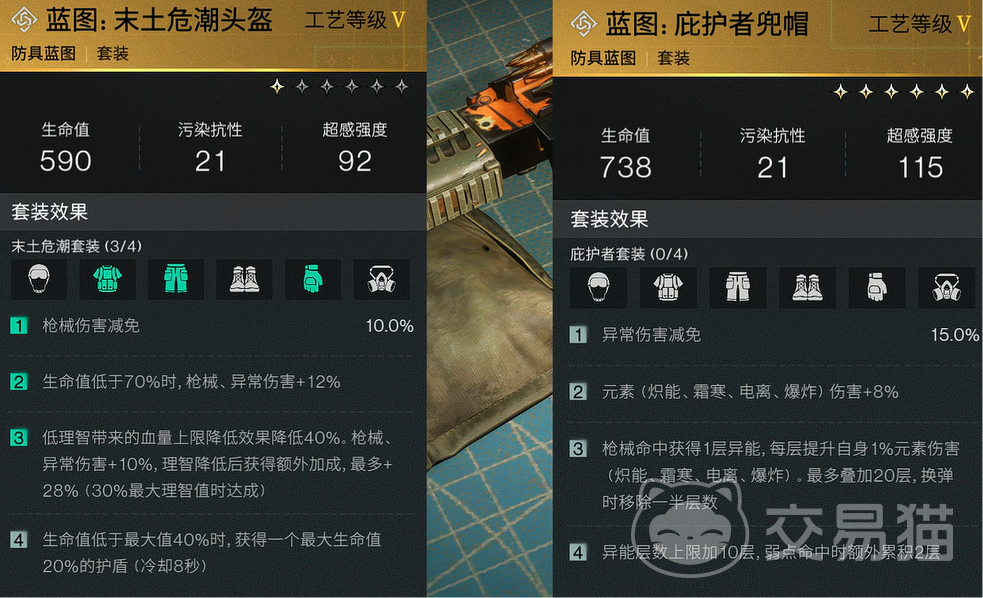 到了后期大家临近毕业时就要用成型的装备了,这里推荐用4件末土危潮套装(当前版本最强增伤,提供护盾和高额伤害。头部、面具、裤子、鞋子都用末土套,可以凑4件套效果;衣服的话,可选判客(换弹速度)或庇护(异常减免),手套继续沿用BBQ手套。