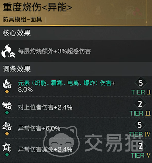 当然准备了防具之后,大家也要配备好相应的模组。头盔推荐用异常专家(重度烧伤),衣服可以使用异常免疫/快速返场裤子;至于手套则用精准充能手套,可以获得暴击强化;鞋子的话可用尖峰时刻,机动性更强,或者掩护备战,就能提升生存能力。