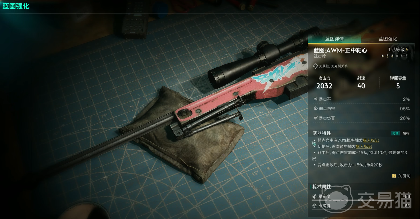 先来讲讲这把武器的特性,首先是猎人印记:攻击弱点时触发,可以大幅提升后续伤害。它的整体风格偏向于速射,可以加快拉栓速度,提高DPS。最后还带有精准伤害特性,对弱点攻击有额外加成,适合狙击流玩法。