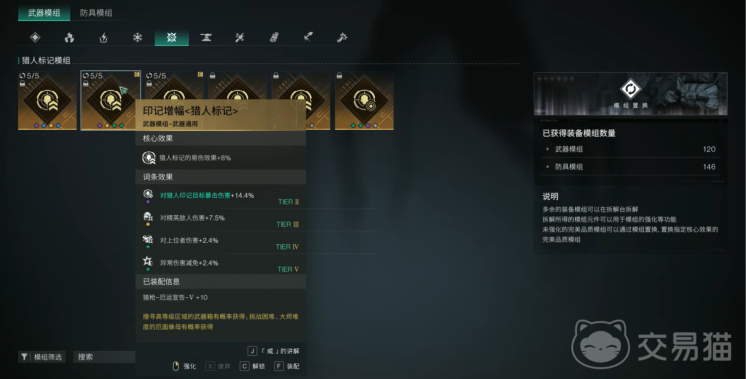 武器模组方面的话,这里优先选择印记増幅<精准>。不仅可以提升易伤效果,又可以增加弱点伤害和枪械伤害,所以可以轻松增加不同乘区的伤害。副武器上的模组推荐用持续快枪<快枪手>,可以让你在快枪手状态下,提升状态持续时间以及伤害。