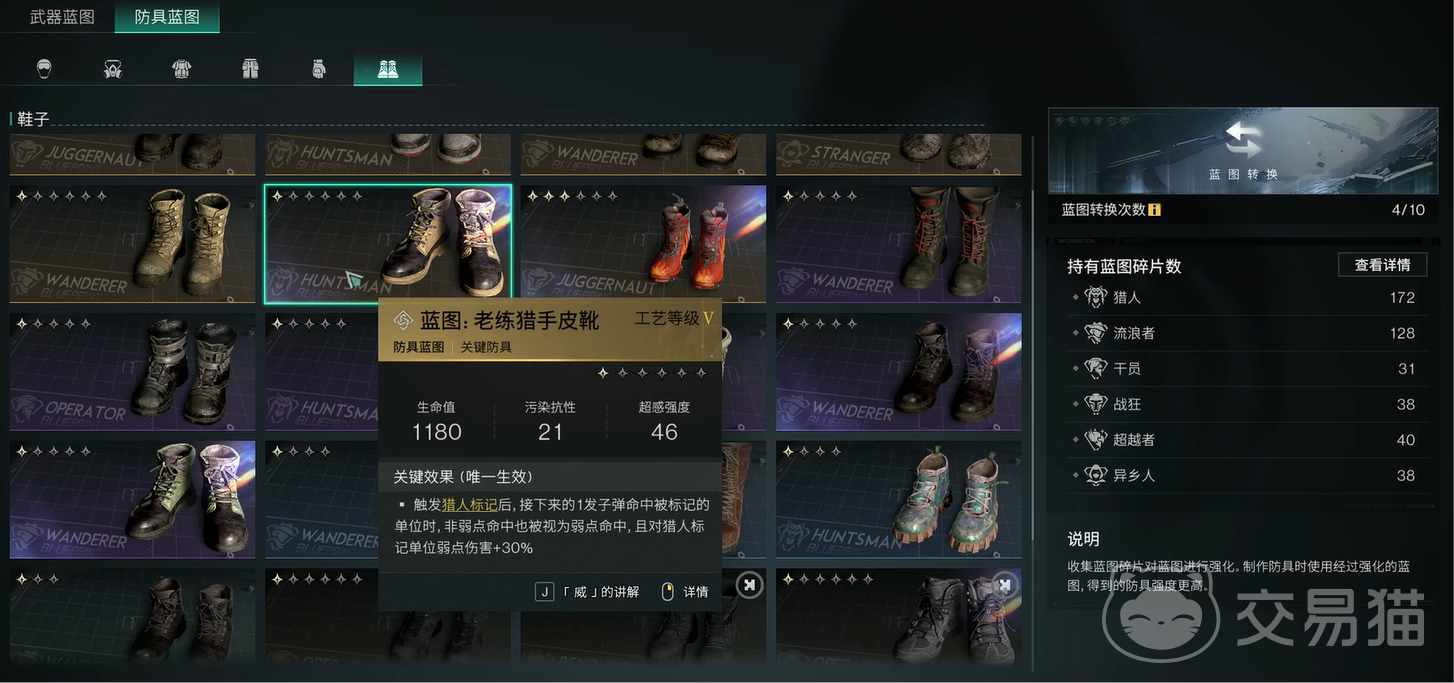 鞋子上的话,可以选择老练猎手皮靴。当你触发猎人标记后,接下来的一发子弹命中被标记的单位时,非弱点命中也被视为弱点命中;且对猎人标记单位弱点伤害加30%,这个效果非弱点命中也被视为弱点命中,就算boss本身没有任何弱点,依旧可以在他身上打出弱点伤害。