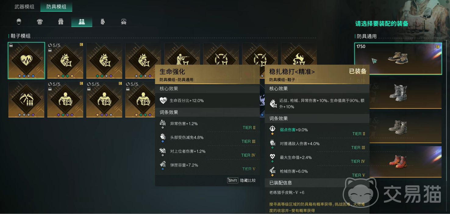 至于头部模组的话,就推荐大家用精准打击,同样可以增加弱点伤害。衣服模组的话,可以选择快速返场,可以提升弱点伤害的同时还带来庇护效果,增加生存能力。裤子模组的话,就可以用百步穿杨<精准>,同样可以提升弱点伤害。最后鞋子的话,就可以选择用稳扎稳打,除了可以提升弱点伤害之外,还能增加额外10%伤害,更令人喜爱!