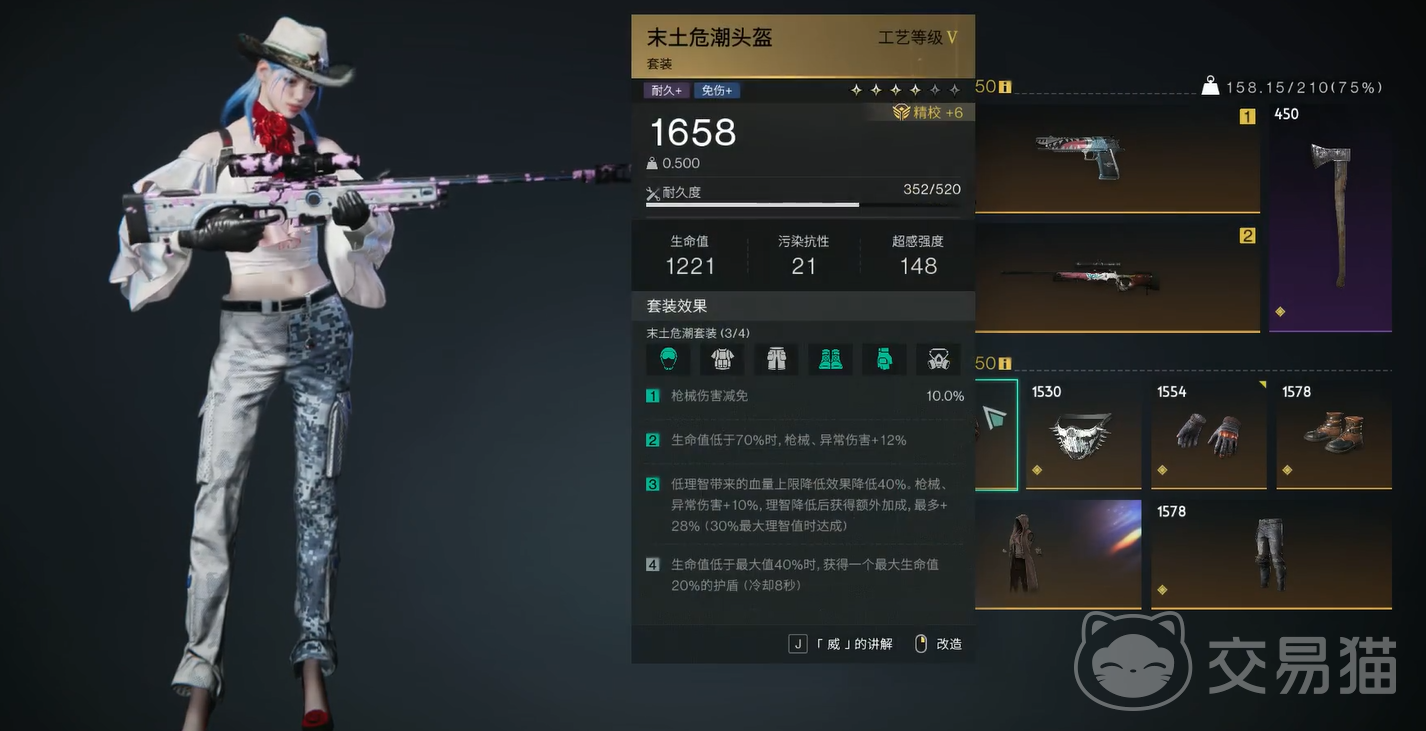 至于装备方面的话,推荐大家用三件末日套,分别是头盔+鞋子+手套。可以带来高额伤害减免提升,增强自身的生存能力;然后还可大幅度提升爆炸和枪械伤害,并且理智、血量越低,伤害加成也就越高,让你轻松实现逆风翻盘。