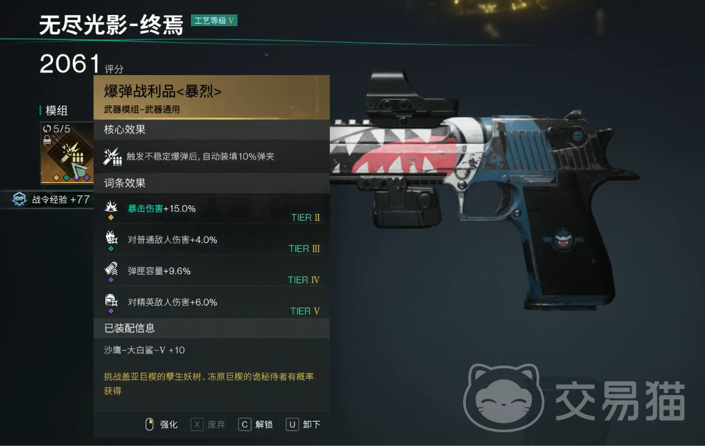 首先大白鲨的全名叫做无尽光影-终焉,由于外表酷似大白鲨所以才因此得名。它的武器特性可以让它命中敌人时,可以触发不稳定炸弹,并且增加爆炸元素伤害并增加暴击率,是一把爆发伤害特别高的武器。属性方面为速射风格,能增加弹匣容量并迅速射击。
