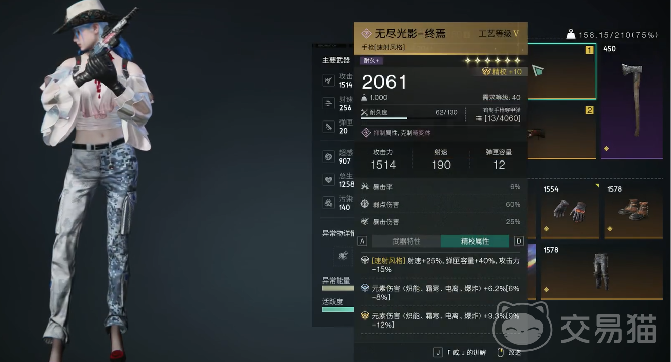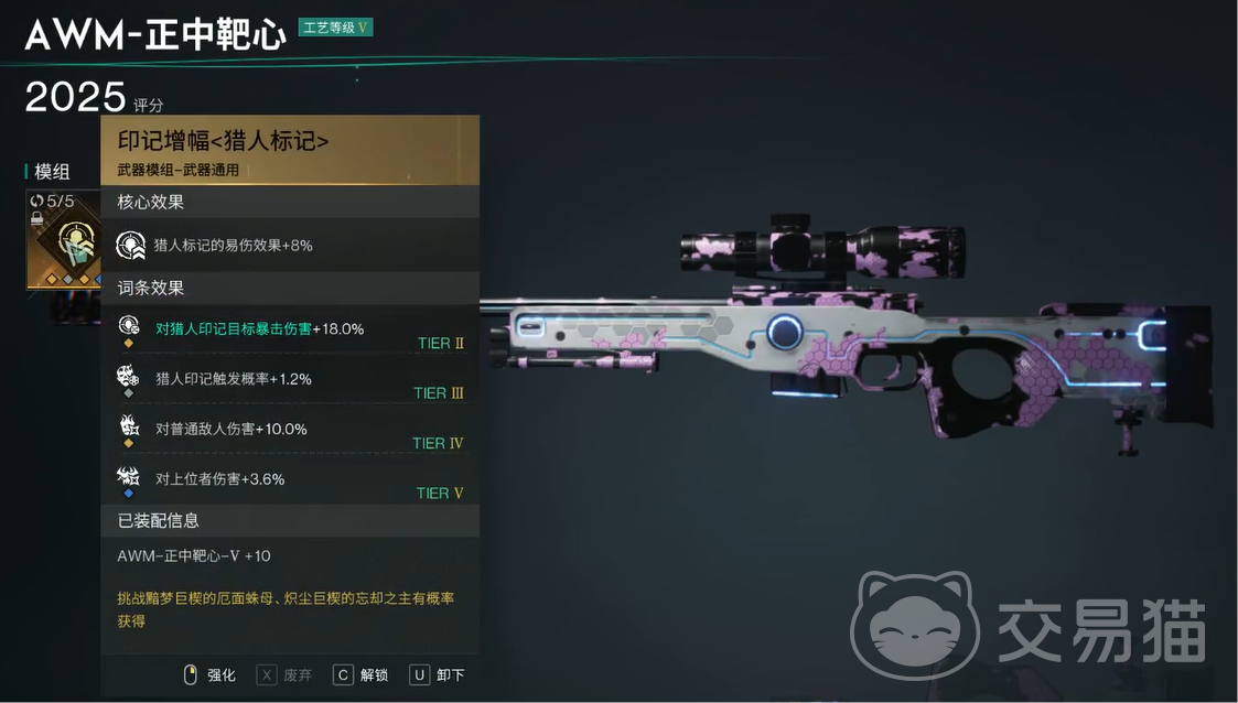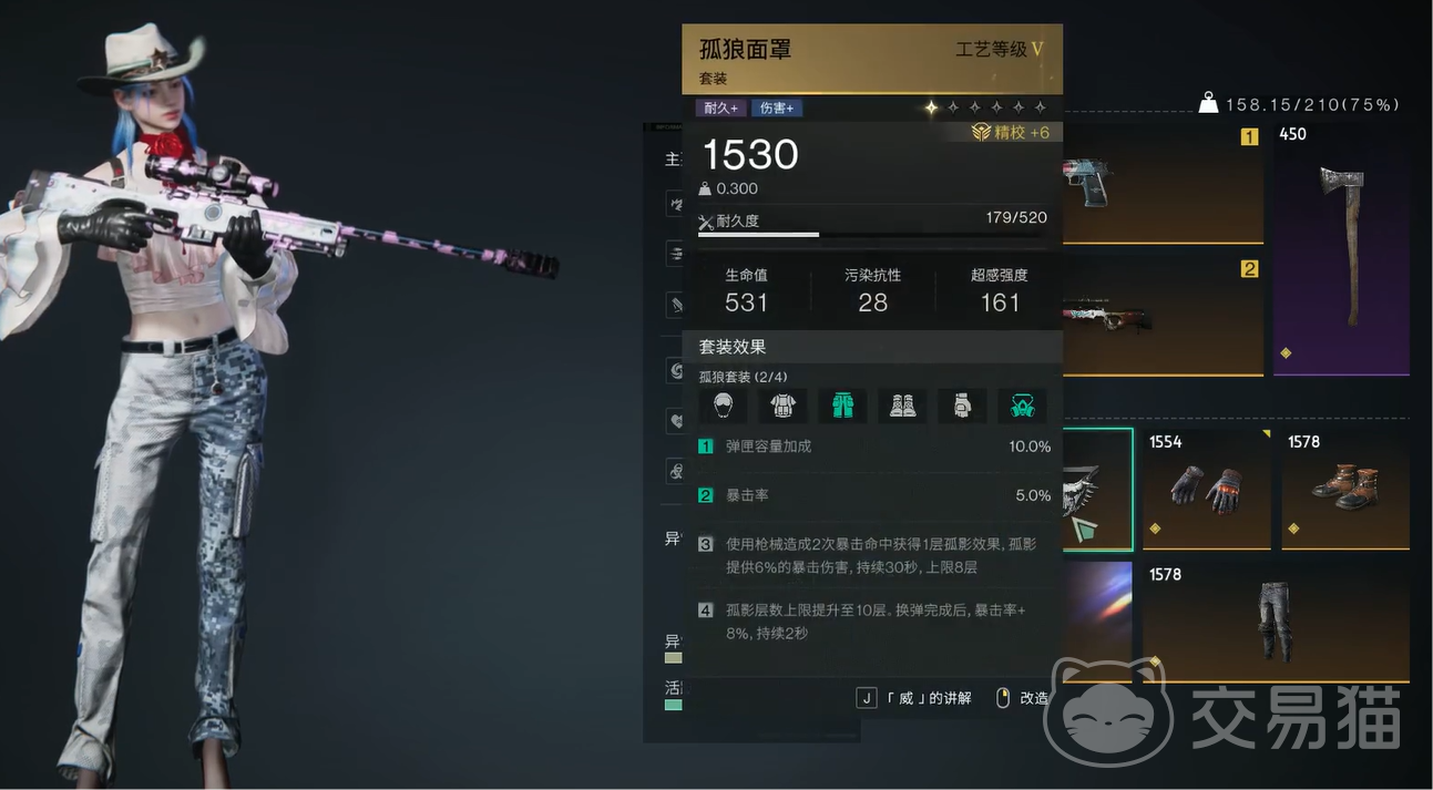 之后还可以搭配孤狼两件套(面罩+裤子),可以让大家获得10%的弹匣容量加成,以此增强持续输出能力。然后还可进一步提升暴击率,让大家可以轻松打出多发暴击伤害。关键防具可使用萨满秃鹫上衣,触发不稳定爆弹后,暴击率+35%,持续3秒。