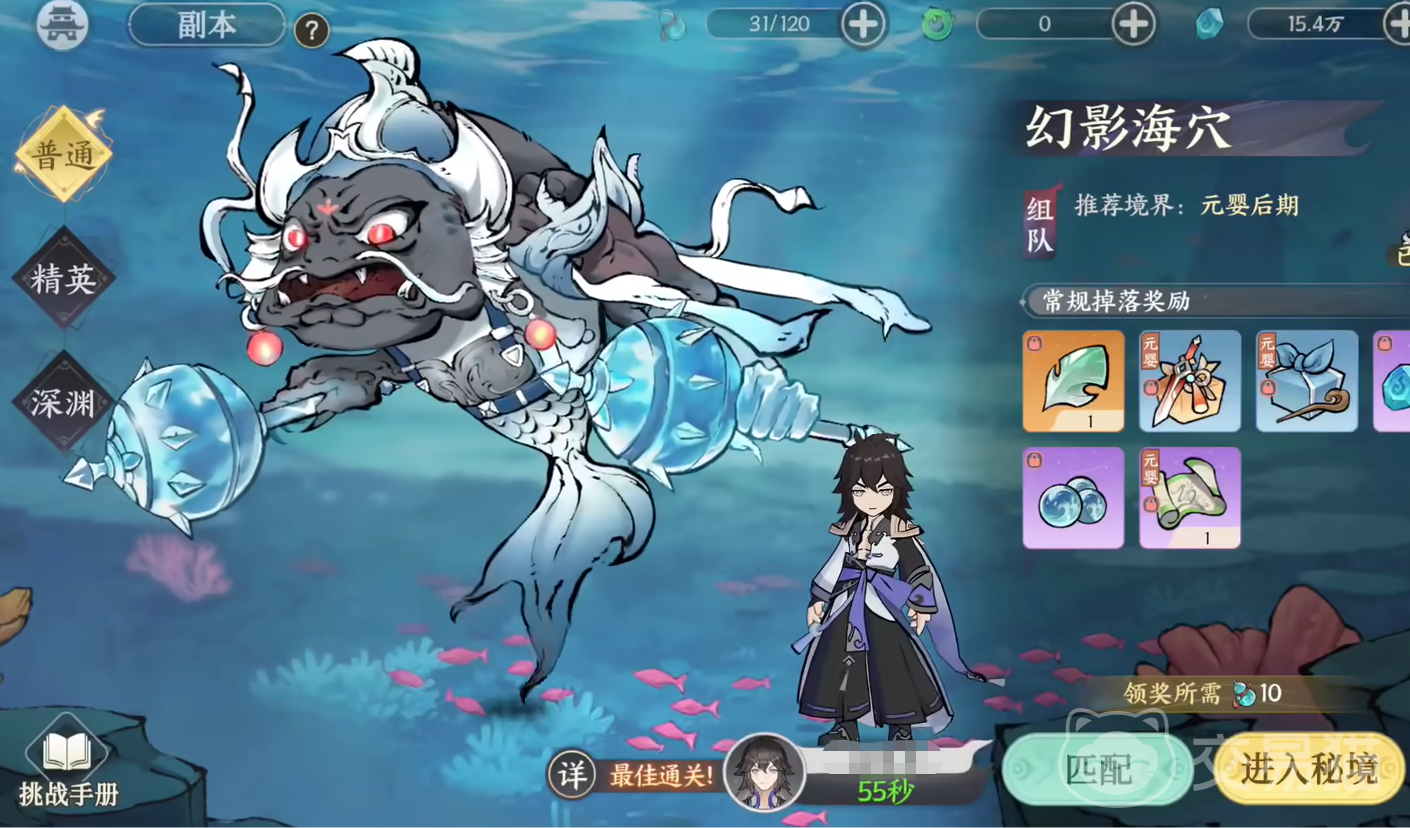 大家可以先来看一下幻影海穴是怎么样的一个副本,作为一个元婴后期才能够攻打的副本,需要花费10个葫芦才能够进入,如果成功通关的话,就可以获得各种奖励。其中就包括各种元婴期的法宝或者秘籍,当然刚开始大家只能刷普通难度,其他难度只有通关之后才能解锁。