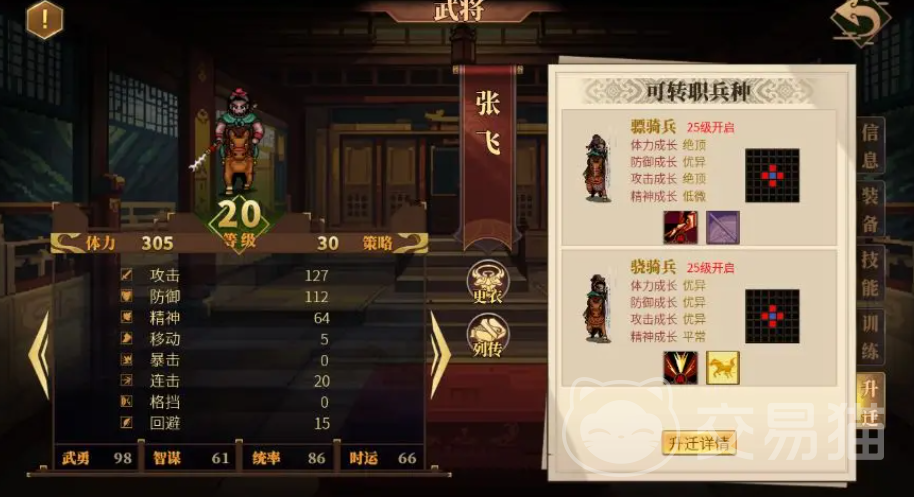 在游戏中除了升迁以外,也会涉及到转职方向方面的问题,每个武将都可以有多个转职方向可以选择,不同的转职方向所赋予的技能属性加成都是不一样的。举个简单的例子,刘备作为整个游戏的核心角色,在升迁的时候他只能够固定选择,要说刘备在各方面都应该均衡的发展。关羽推荐转职为勇将,这样能够放大他的攻击性和单挑的优势,张飞则适合转职为重骑兵,能够有效地提升防御跟生存能力。