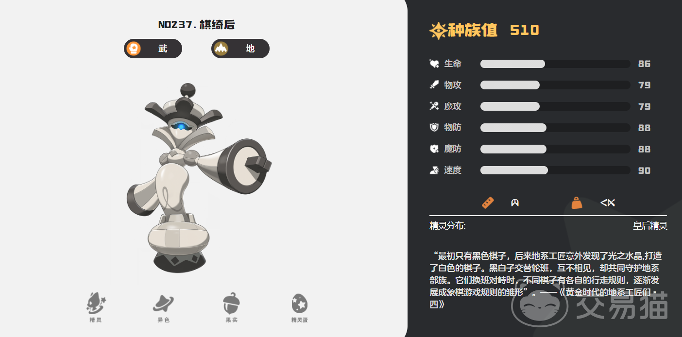 棋绮后属于皇后精灵,其背景故事颇具传奇色彩。相传最初仅有黑色棋子,而后地系工匠意外发现光之水晶,打造出白色棋子。黑白棋子交替守护地系部族,虽互不相见,但在换班对峙时遵循的独特行走规则,竟逐渐演变成象棋游戏规则的雏形。想要将棋棋进化为棋绮后,需满足特定条件:让33级的棋棋击败3次棋绮后(黑子),方可完成蜕变。