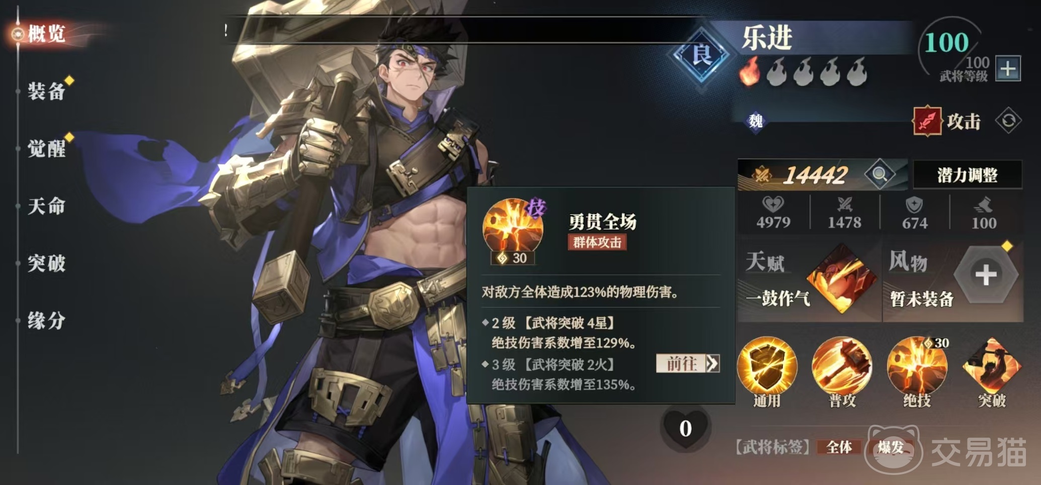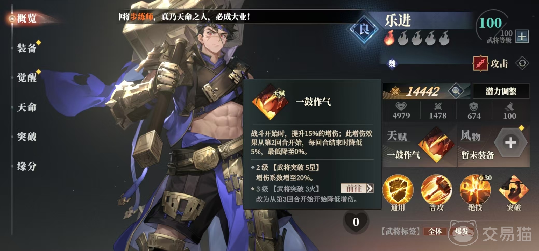 乐进的自身绝技勇冠全场,是一个很好用的群体攻击,他能对敌方全体造成最多135%伤害系数的物理伤害。天赋一鼓作气,战斗开始时获得15%增伤效果,从第二回合开始,每回合会降低5%。突破之后增伤系数最多能达到20%,改为从第三回合才降低增伤。突破之后的升星天赋,改为与自身和同排和同列队友也一起生效。这就相当于乐进的增伤效果,几乎能够覆盖整个阵容。
