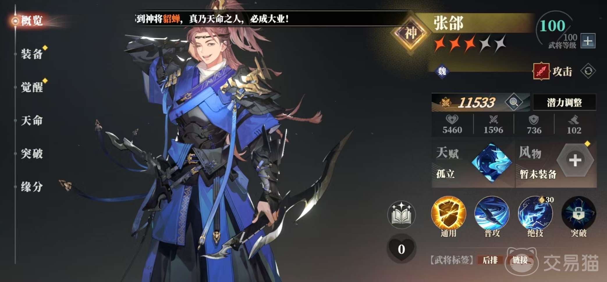 只要大家能够将乐进培养起来,达到突破五火的程度,为全体带来的增伤绝对是非常有效的,所以乐进完全值得大家作为副c去培养,在很多战斗中,群体输出也都能起到关键的作用。在阵容搭配方面,小编选择的是乐进、张郃、张辽、曹仁,这4人组成魏国阵容。曹仁当然是前排肉盾,至于张和和张辽这二人都是输出,但张辽明显是绝对的主c,张郃主要是利用自身的天赋,为目标降低免伤,以及利用绝技链接起来,让张辽伤害达到最大化。