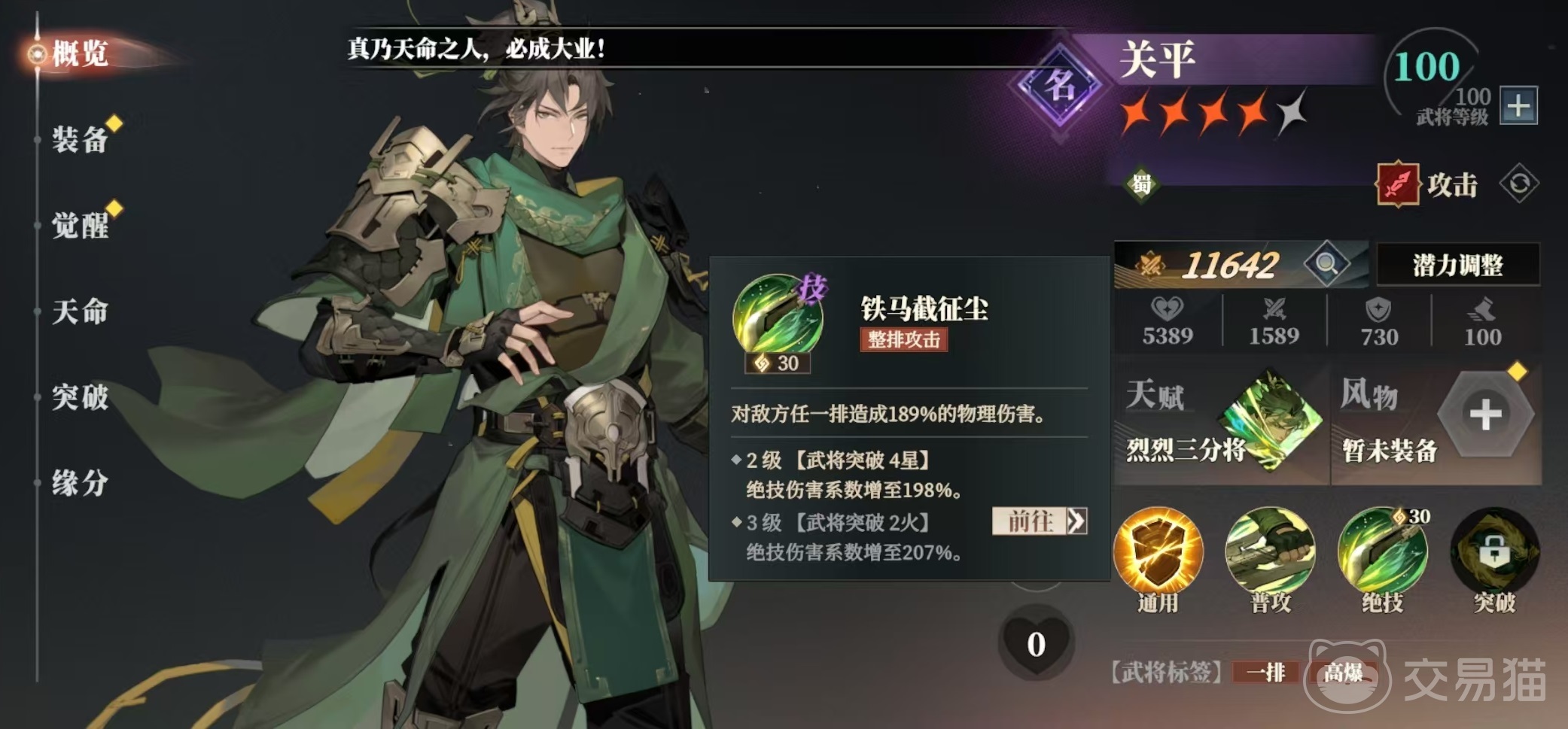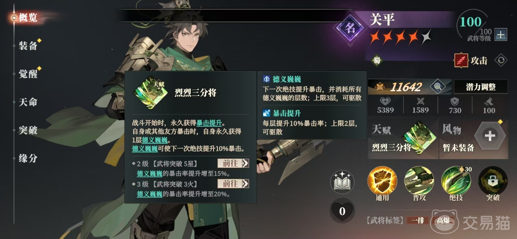 关平是属于攻击类型的武将,它的绝技能伤害敌方一排目标,突破之后,绝技伤害系数比较高。天赋烈烈三分将,战斗开始时,永久获得暴击提升效果,自身或者是其他友方单位打出暴击时,自身永久获得一层德义巍巍。德义巍巍效果能使下一次绝技提升最多20%暴击率,每层暴击提升,可以提升10%暴击率,这样叠加起来,关平在暴击方面还是很出色的。