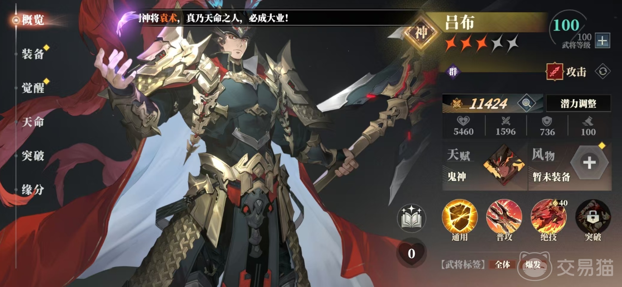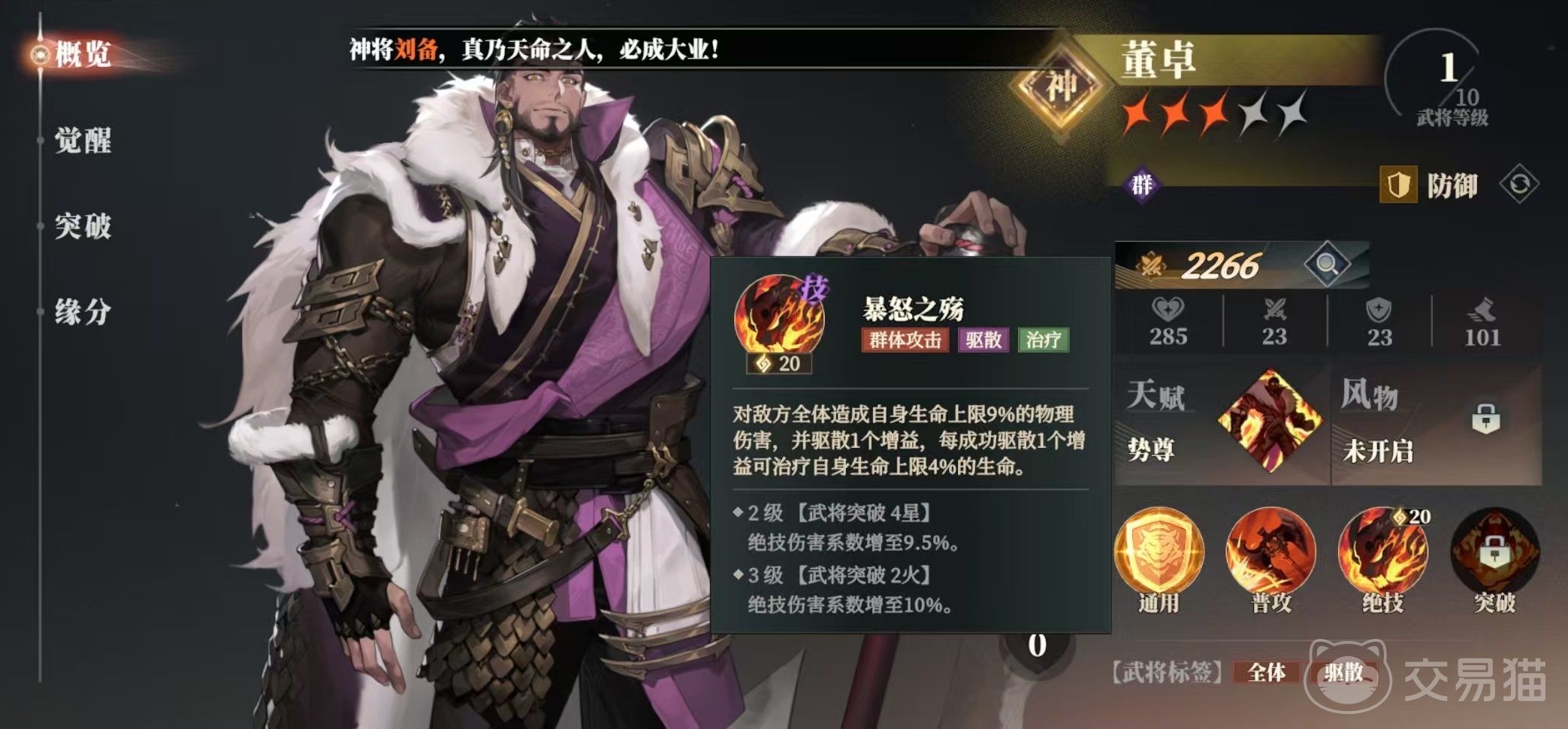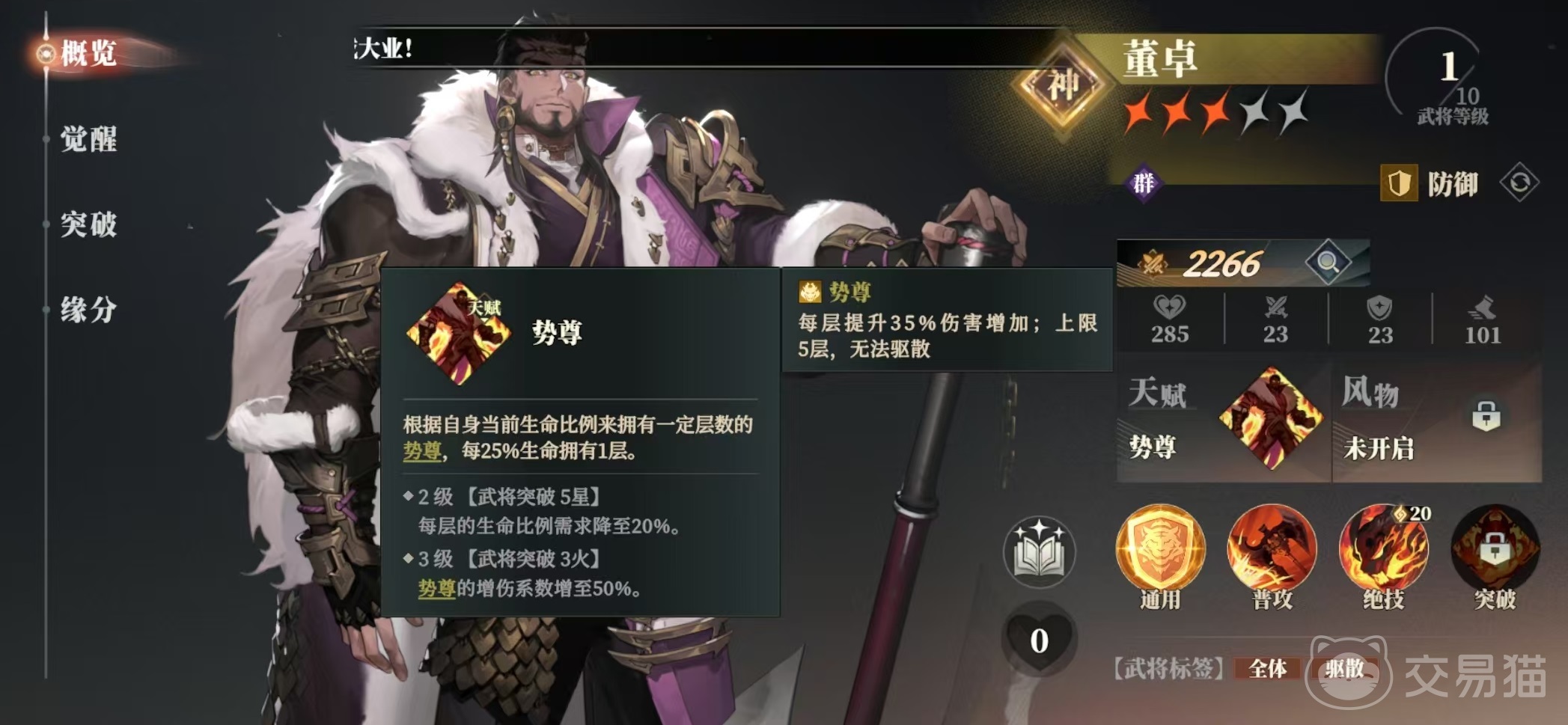董卓的绝技能够对敌方全体造成一次物理伤害,是按照自身生命上限最多10%来进行计算,并驱散一个增益效果。每成功驱散一个增益,就能够对自身进行一次治疗,恢复4%上限的生命值,这个技能既有群体攻击又有驱散和治疗,非常全能。天赋是根据自身当前生命比例来获得势尊层数,每25%的生命就可以获得一层,每层提高35%伤害加成。突破之后,每层生命比例需求会降低至20%,增伤系数则提升至50%。