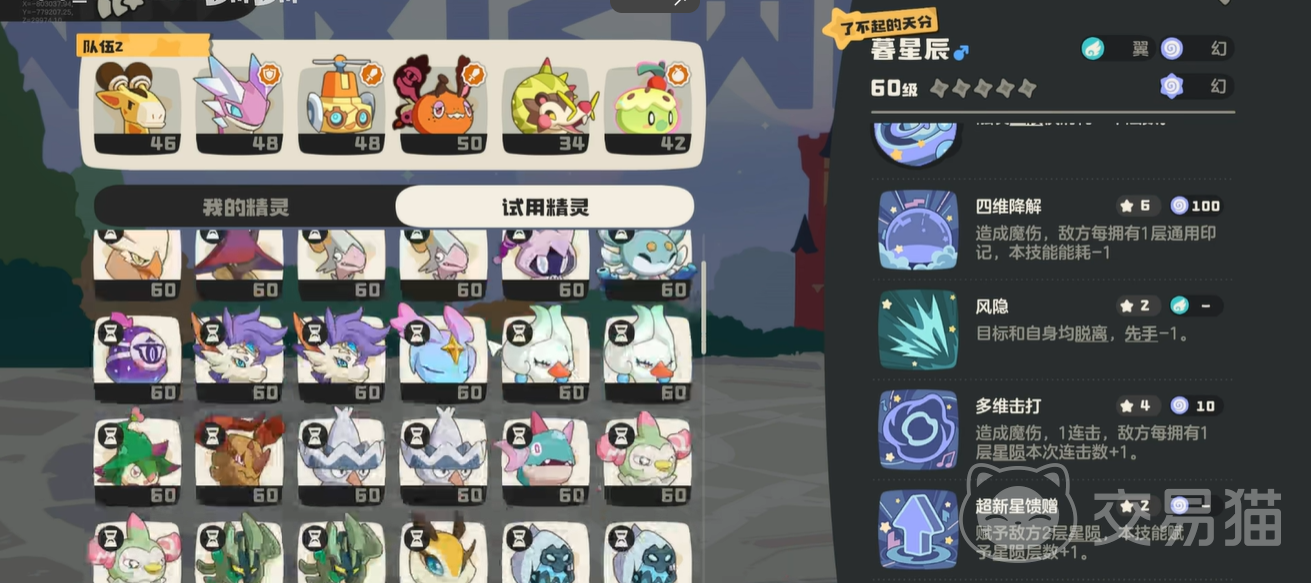 当然仅靠星陨的单体技能想要秒杀绝大部分的精灵是比较困难的,所以需要通过技能搭配来强化暮星辰的伤害,这样才能确保一次星陨就能秒杀,技能方面推荐四维降解,风隐,多维打击以及超新星馈赠,首先第一个技能四维降解,再释放技能以后可以降低自身的能量消耗,使得暮星辰可以高频率释放星陨。