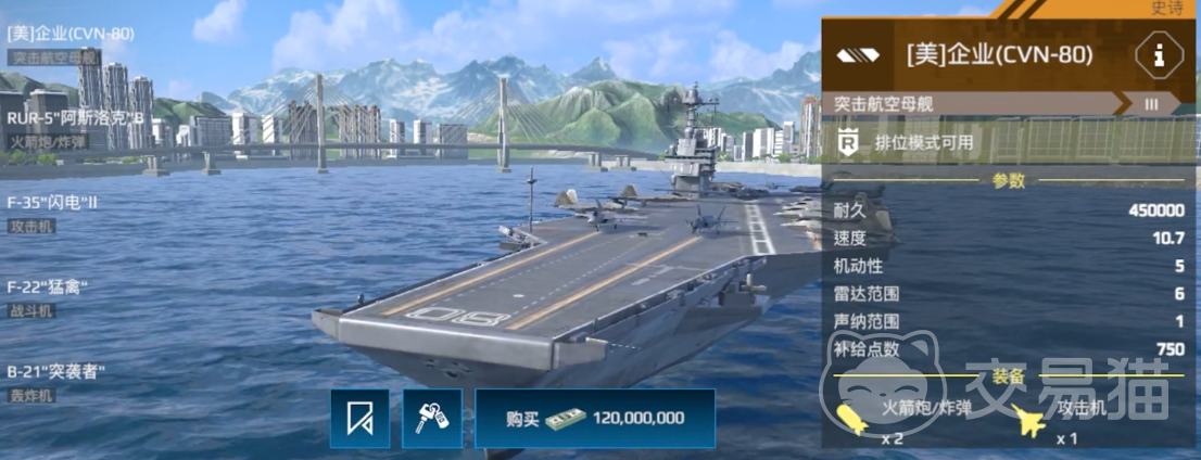 首先是美金突击航母中的企业号和暴风雨。相较之下,更推荐企业号。企业号的血量更高,舰载机配置也更加均衡,搭载了攻击机、战斗机、无人机、轰炸机和直升机各一架,配置非常全面。而暴风雨虽然增加了两枚导弹和一架直升机,但减少了一架无人机,且缺乏可替换防空系统。在当前流行的三机联攻玩法中,无人机不仅能有效诱导敌方热诱弹,还能补充一定的输出能力,缺少无人机在实战中是一个不小的短板。