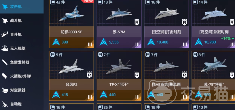在市场装备中,打击时刻虽然价格高但性能极强,是攻击机中的天花板。其他推荐的还有PSF、J16、F2超改等,都是当前版本表现出色的机型。拦截机方面,目前最值得投入的仍是F15。直升机除了前述推荐之外,价格较高的几款如直19、直20也都很有潜力,值得关注。