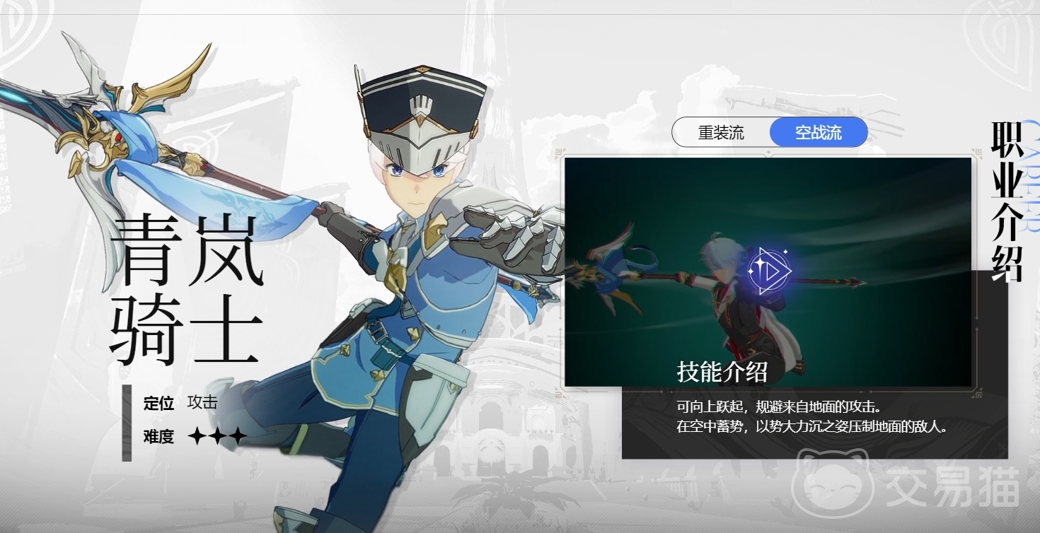 翔跃斩是空战骑士的核心起手技能,可让角色高高跳跃到空中,并以极高的速度和力量发起一次强力的下落攻击,落地瞬间会产生巨大的冲击波,对范围内的敌人造成重创,空战骑士施展旋风斩技能后,会在空中持续旋转,形成一个敌人难以接近的无敌区域,并对周围敌人造成连续的范围伤害,在使用翔跃斩落地后,紧接着衔接旋风斩,能进一步扩大伤害范围,风驰电掣虽为重装流主要技能,但空战骑士也可合理运用,该技能能使角色在短时间内快速移动,并对周围敌人发动连绵不绝的攻击,疾风骤雨与风驰电掣类似,此技能可让空战骑士在一段距离内迅速接近目标,并以极快的速度连续刺击敌人。