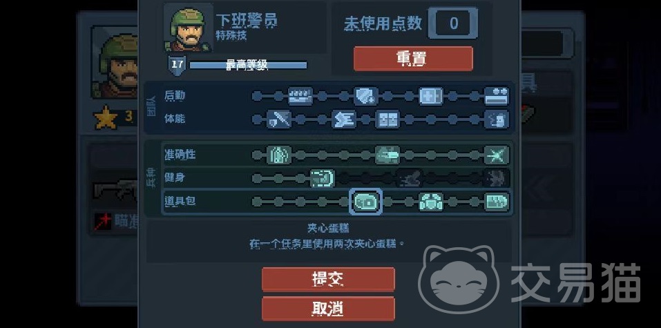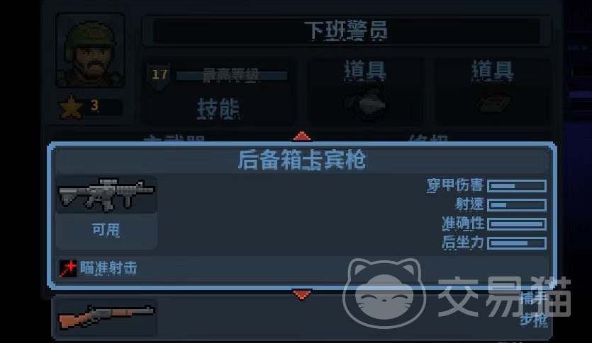 下班警员使用的武器主要包括后备箱卡宾枪、捕手步枪、改装ak,独有的道具是过期夹心蛋糕,它可以带来五秒的无敌效果,不受团队特殊技的影响,主要技能包括薄弱之处,增加所有步枪20%的伤害。+p弹药,可以带来额外装药效果,步枪子弹有过度的穿透力。狩猎季节,所有常规射击,有30%机会产生暴击。击退红发女,增加自己的近战击退和眩晕。夹心蛋糕,在一个任务中能使用两次夹心蛋糕。