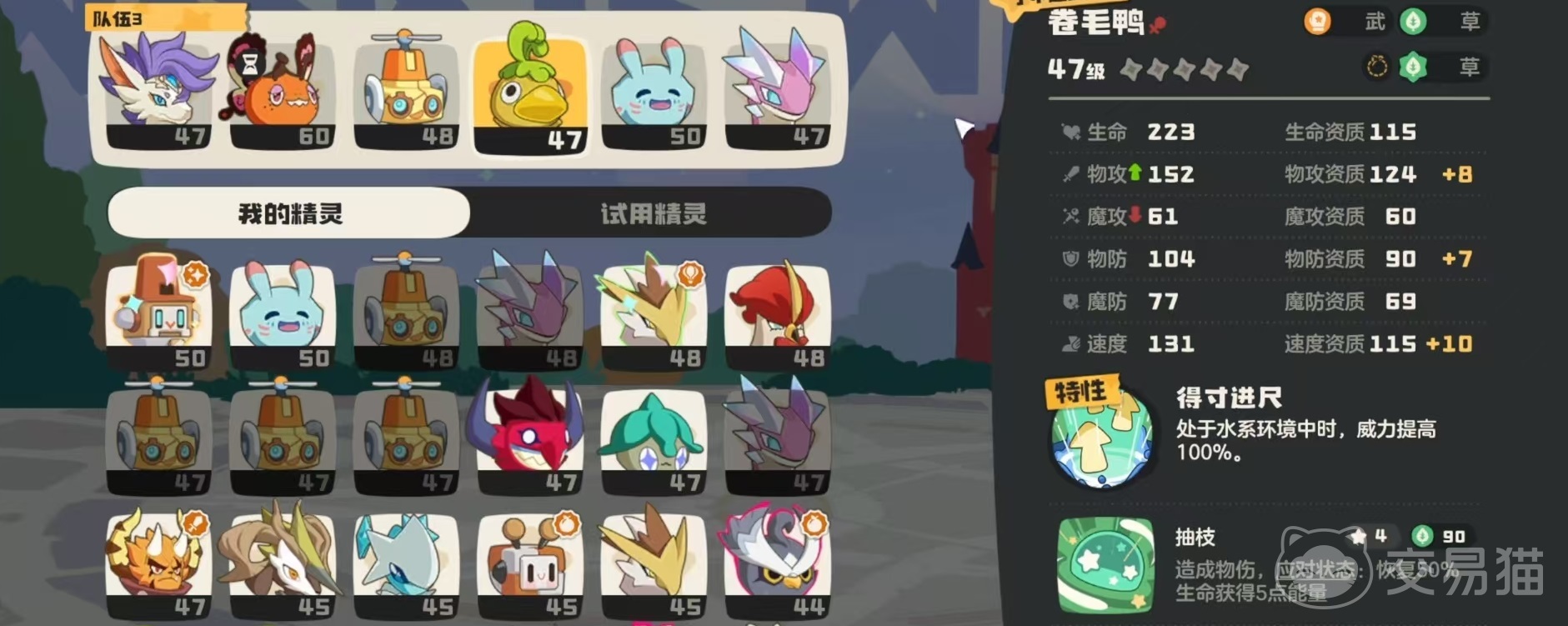卷毛鸭的资质总量为573,其中生命115,物攻124,魔攻60,物防90,魔防69,速度115。其实这样的资质非常容易去搭配性格,因为重点去提升物攻就可以了,魔攻完全可以舍弃,那么加物攻减魔攻的固执,就成为性格的最佳选择。其他加物攻的性格例如孤僻或者是坦率等也可以接受,但都不如固执更加出色。卷毛鸭的特性是得寸进尺,处于水系环境时,威力提升100%。