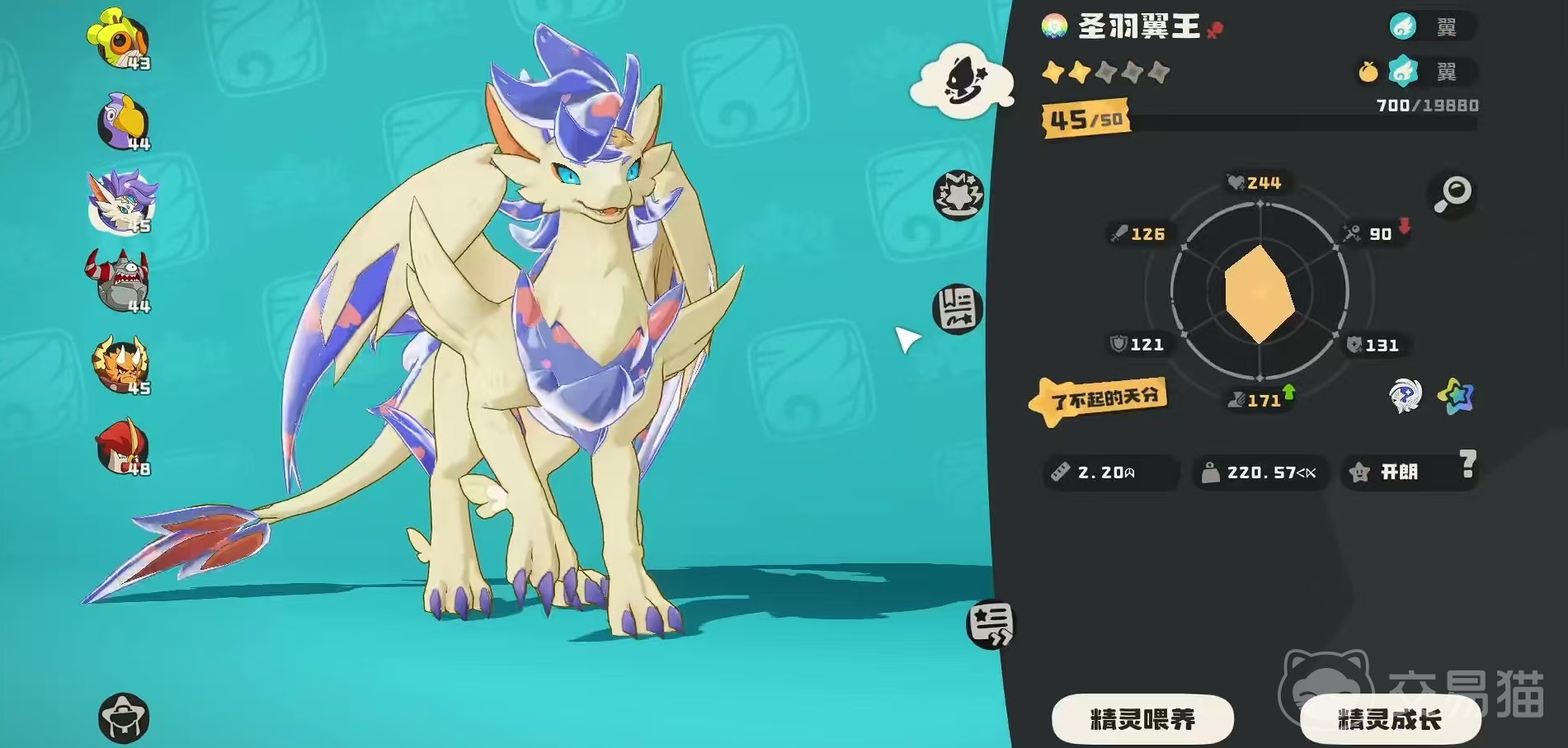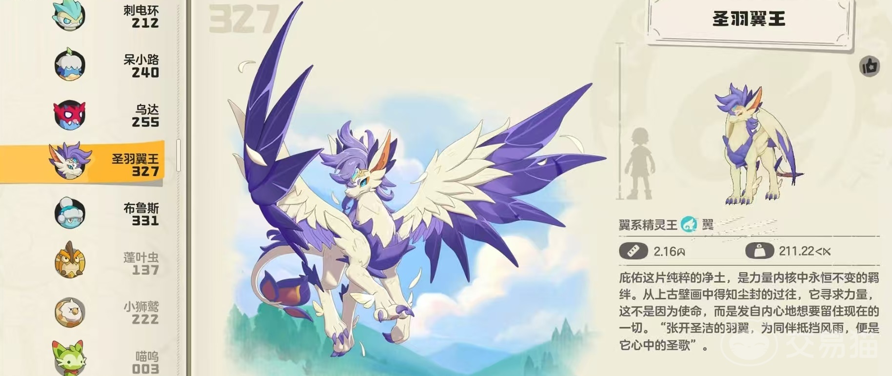 先来看一下圣羽翼王的基本属性,它是由二星灵羽勇士40级进化得到的精灵。特性是飓风,对本精灵的技能,若其他翼系列精灵释放过相同技能,那么则获得迅捷效果。资质方面。总资质为531,其中生命94,物攻60,魔攻60,物防96,魔防96,速度125。在性格方面,如果想追求更高的速度,那么可以选择开朗或者是急躁,如果追求攻击也可以选择勇敢或者是孤僻等。