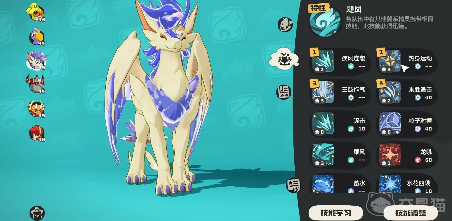 圣羽翼王很适合与爵士鹿一起组成阵容出战,在技能选择方面,小编推荐搭配的套路是疾风连袭、风起、伺机而动和疾风刺。圣羽翼王作为当前游戏版本中非常强势的一个精灵,选择了这些技能,就可以打出非常强的爆发,使用的时候需要注意上场爆发的时机。疾风袭击的效果是释放其他具有迅捷的技能,并将能耗加至本技能的能耗。这个技能可以说是圣羽翼王的核心技能,一定要带上。风起的效果是能直接获得一层风起印记。