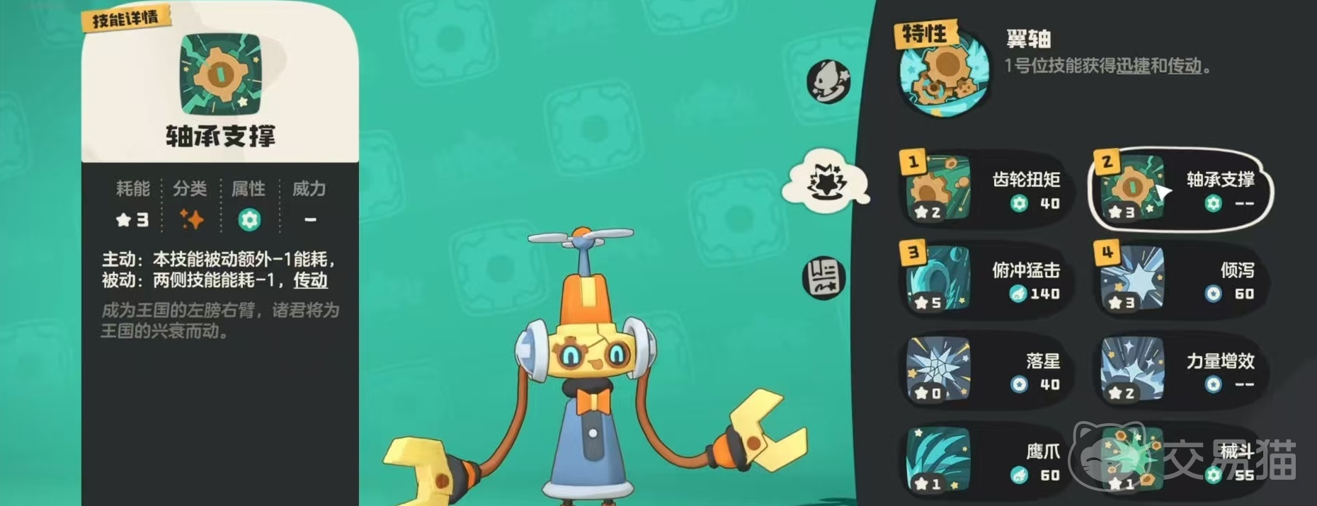 在帕帕斯卡的技能搭配方面,小编选择了一套配置,倾泻、阻断、齿轮扭矩和轴承支撑。倾斜能够造成魔法伤害,并驱散双方所有的印记,这个驱散效果在很多战斗中都有着很强的作用。第2个阻断,造成魔法伤害,应对状态造成打断,打断在pk中非常重要。齿轮扭矩,造成物伤,本技能每变化一次位置,技能威力就能增加30。轴承支撑,有主动和被动的两个效果,主动效果是本技能被动额外降低一点消耗,被动效果是两侧技能能量消耗降低一点。