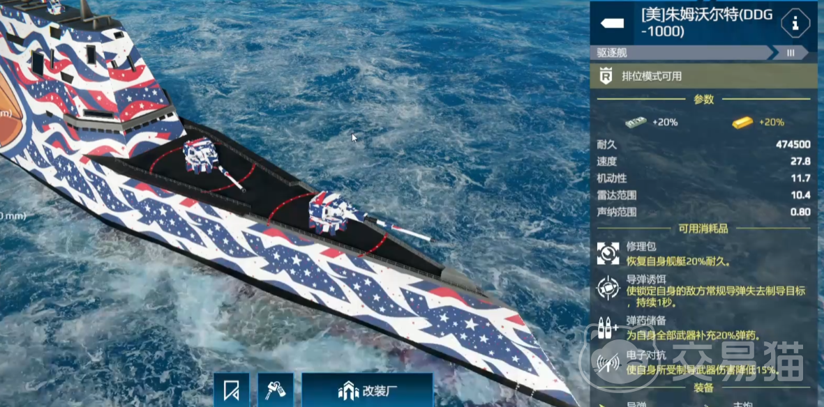 科技感十足的隐身猎手,这艘美驱的最大特点在于其极高的隐身性和远程精确打击能力。配备155mm先进舰炮系统,适合中后排打击与游走压制。优势在于隐身性优秀,难以被敌方雷达锁定。155mm舰炮爆发力极高,能打出超远程打击。电磁干扰设备丰富,具备优良的抗控性能。舰炮+中程导弹结合,提高战术多样性。