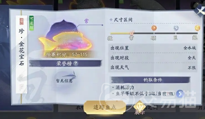 比方说金花宝石鱼的积分一般是57到115,尺寸越大品质越好才会越接近最高积分,有时候甚至会出现一条比两条更强的情况,玩家通过垂钓获得的积分,会录入到活动排行榜之中,排行榜会决定决赛的名额。