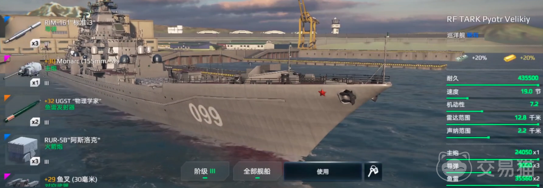 第三艘则是大名鼎鼎的彼得大帝了,他拥有着整个游戏为数不多的强大火力。并且可以装下三枚导弹,所以爆发性伤害更高。另外还可以装配一门主炮再加上两枚鱼雷,再搭配三门火箭炮,就是一艘行走的战舰,让人感觉恐怖如斯。不管是日常刷钱还是真人局,都特别好用。
