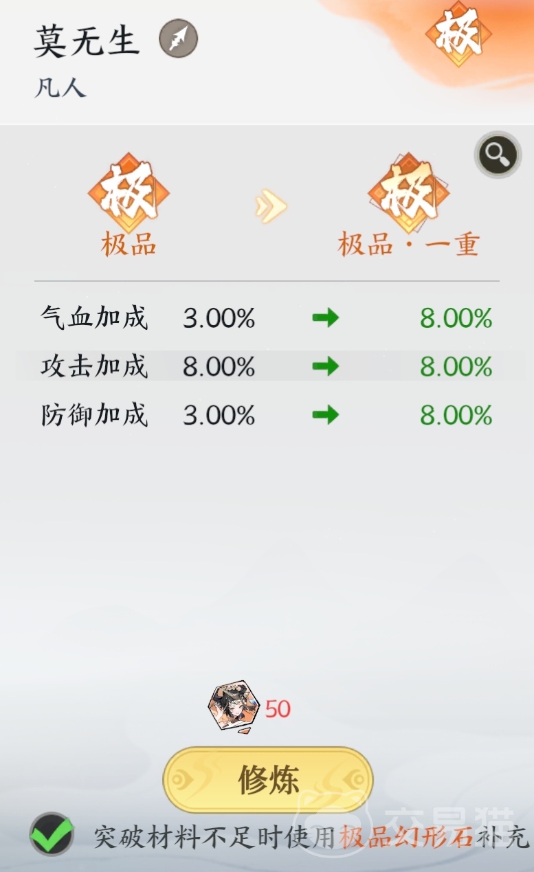 在角色培养方面,更抽到的莫无生是最原始的状态,之后玩家还要不断地提升它的等级和品级,其中升品给角色带来的提升更大,所以要优先去提高角色的品级,升品所需的伙伴碎片,可以通过符绘莲华抽取,也可与角色进行双修来得到,大家每天能免费双修十次,同时就能得到十个碎片,还能花费精元去完成秘法双修,每天最多能完成三十次并得到三十个碎片。